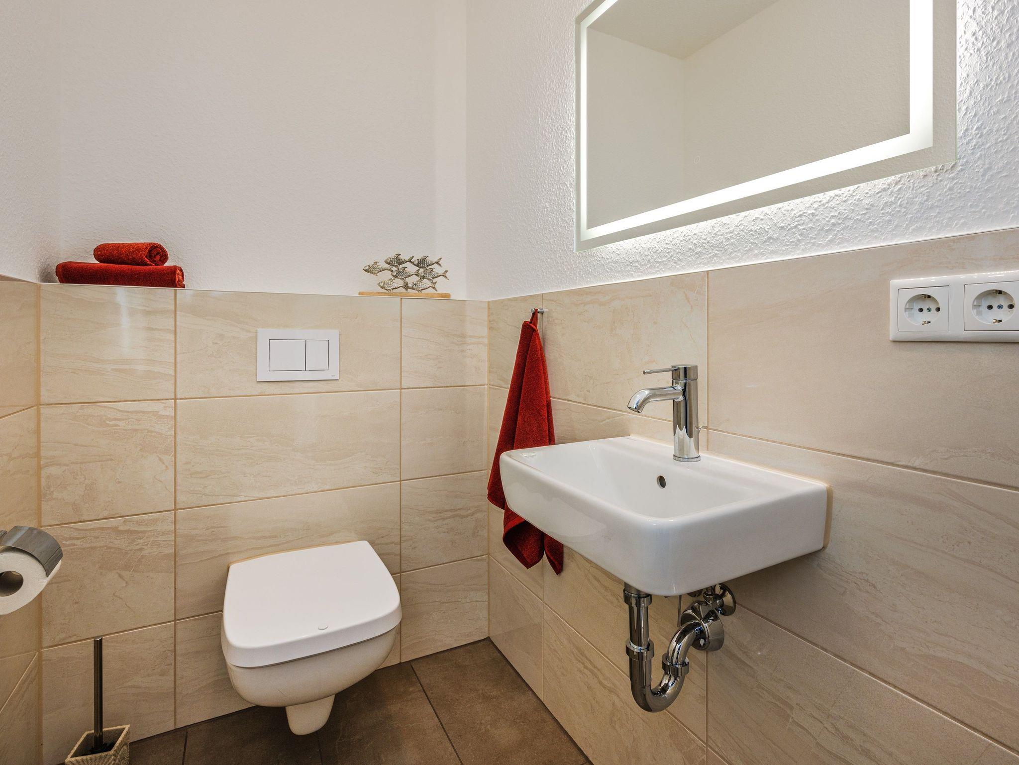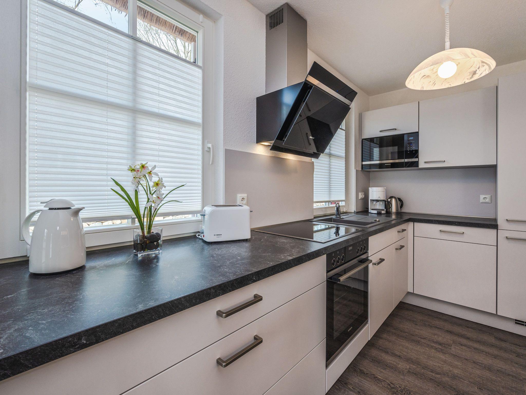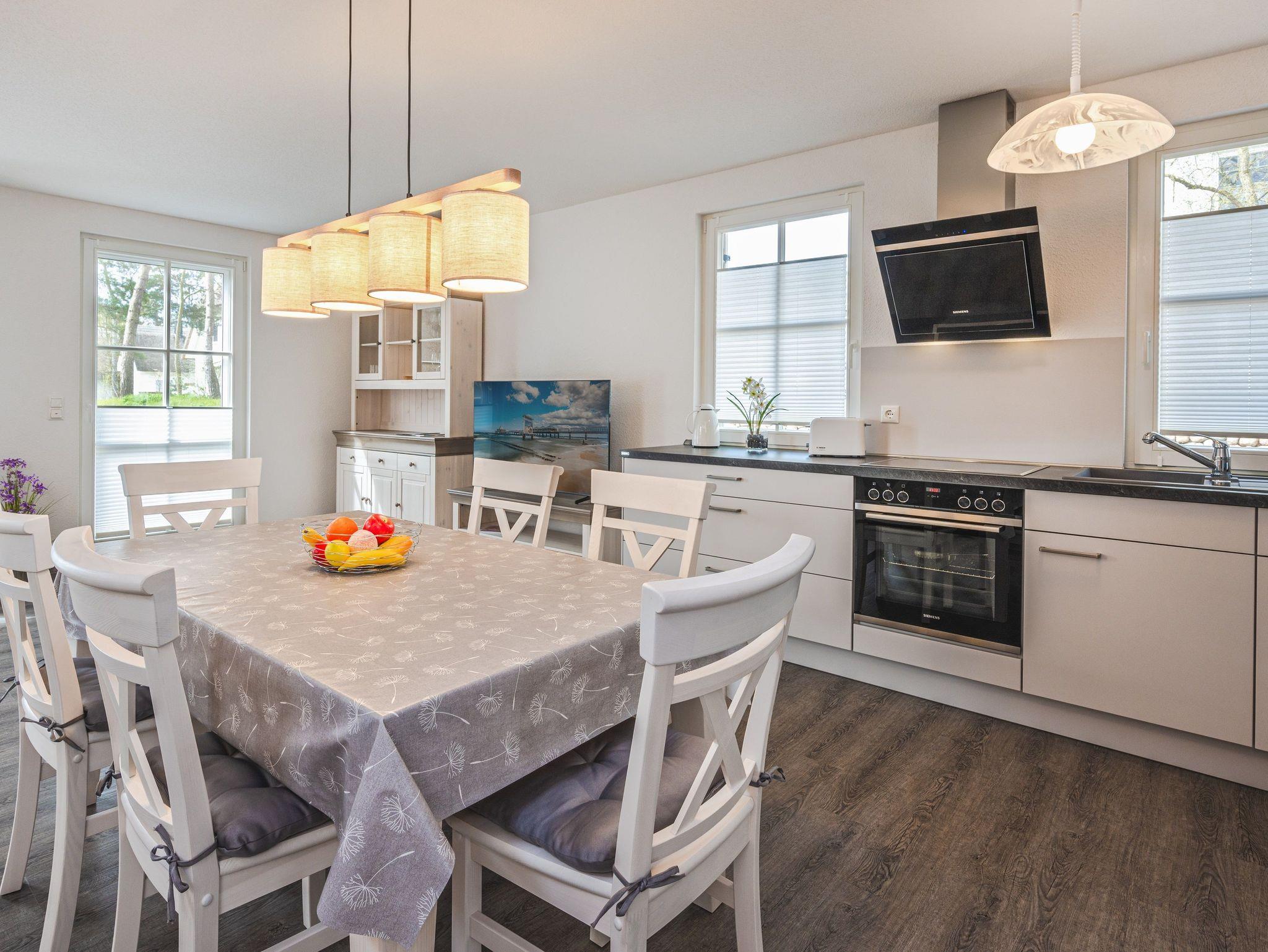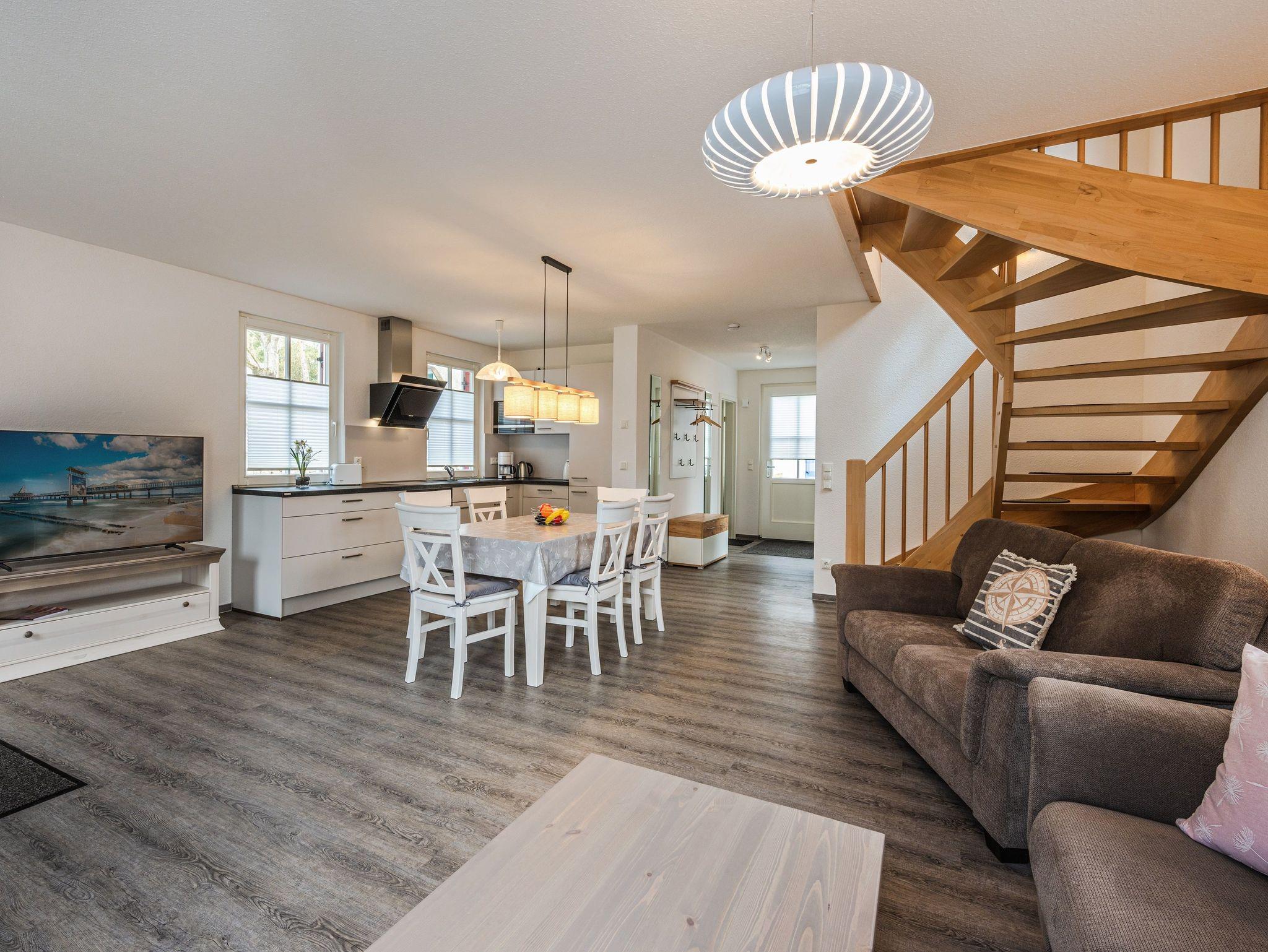 Küche und Essbereich befinden sich ebenfalls im Wohnzimmer und sind modern ausgestattet mit Backofen, Kühlschrank mit Gefrierfach, Kaffeemaschine, Toaster, Wasserkocher, Herd, Mikrowelle und Spülmaschine. Im Erdgeschoss finden Sie zusätzlich ein Gäste-WC und die hauseigene Sauna. Vor der Sauna befindet sich eine weitere Dusche und ein Waschbecken ? perfekt nach einem aktiven Tag.