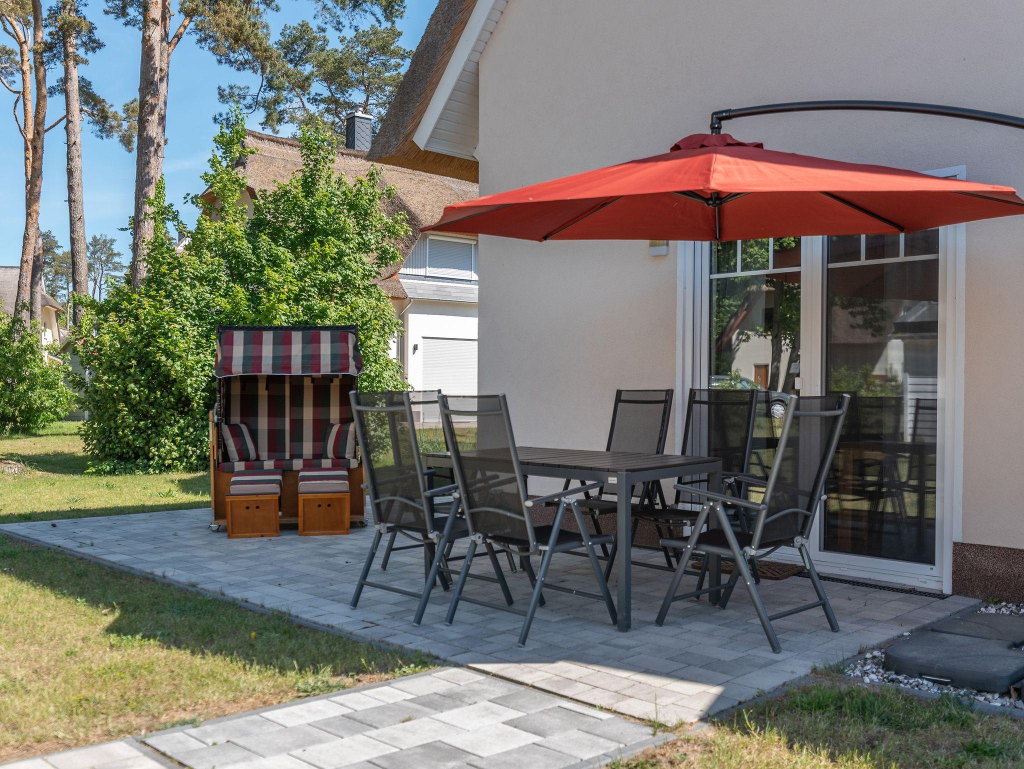 Zur Außenausstattung zählen eine zweiseitige Terrasse mit Strandkorb, Sonnenliegen, einem Kugelgrill und einem Gartentisch, der Entspannung unter den Kiefernkronen verspricht.
