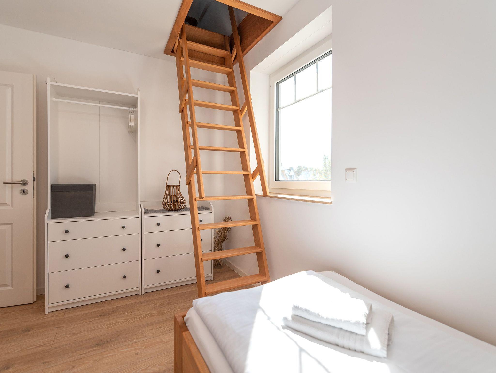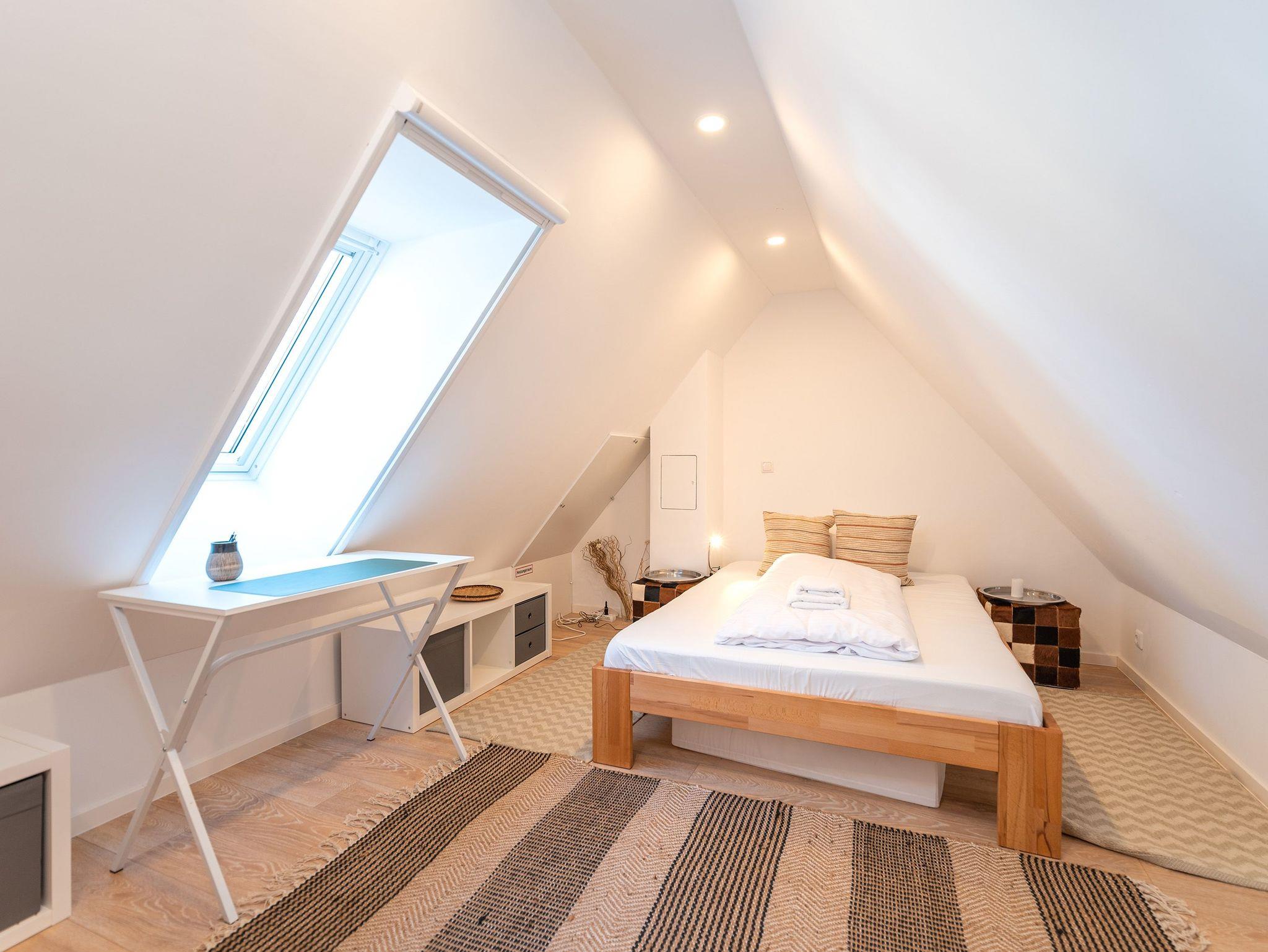 • Ein drittes Schlafzimmer/Dachboden mit einem französischen Bett (1,40m breit), erreichbar über eine Leiter, das zusätzlich mit einem Schreibtisch ausgestattet ist.