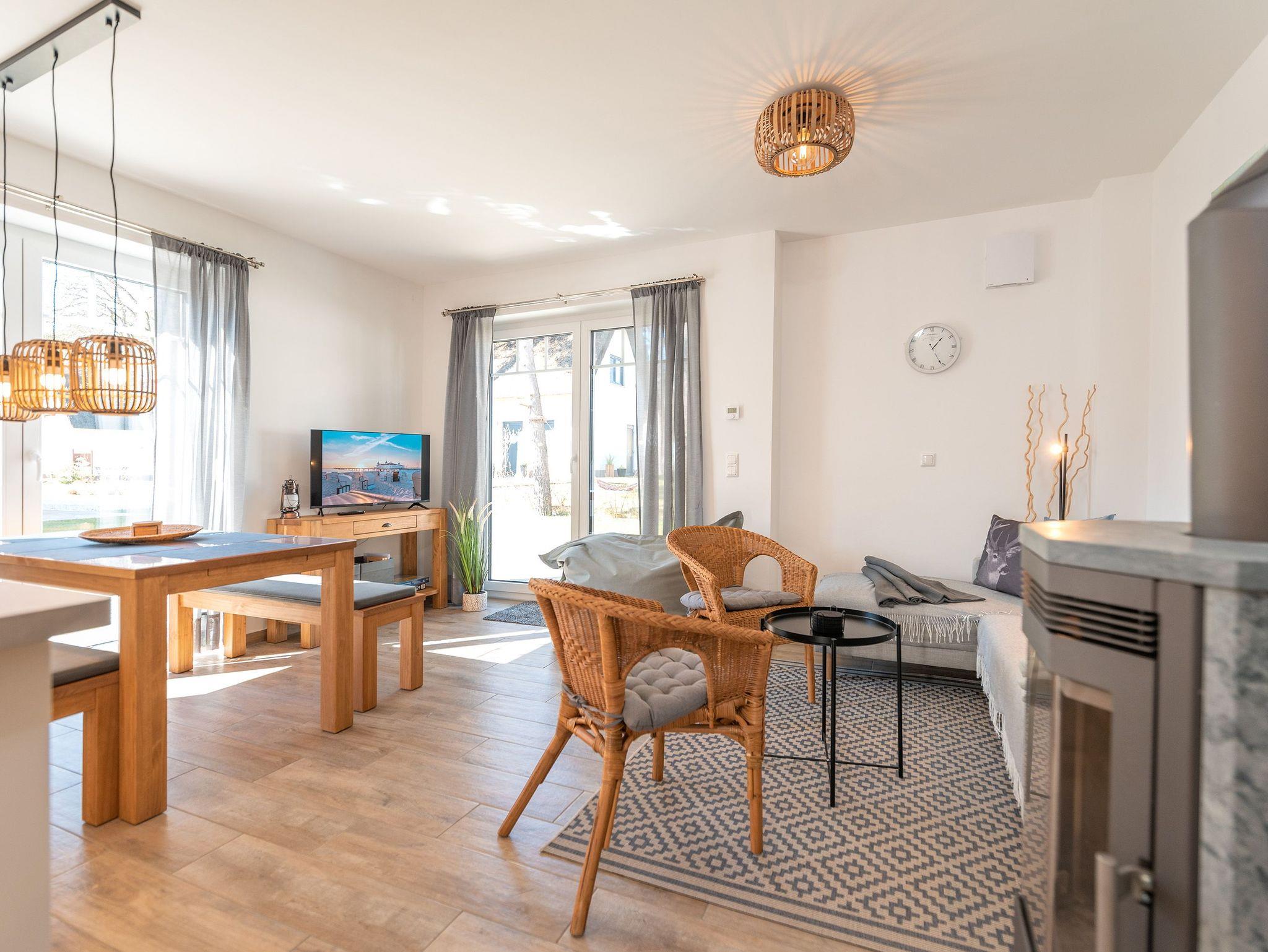 • Ein offener Wohnbereich mit Kamin, TV und einer Sofaecke, ideal für entspannte Abende oder Spiele mit der Familie.