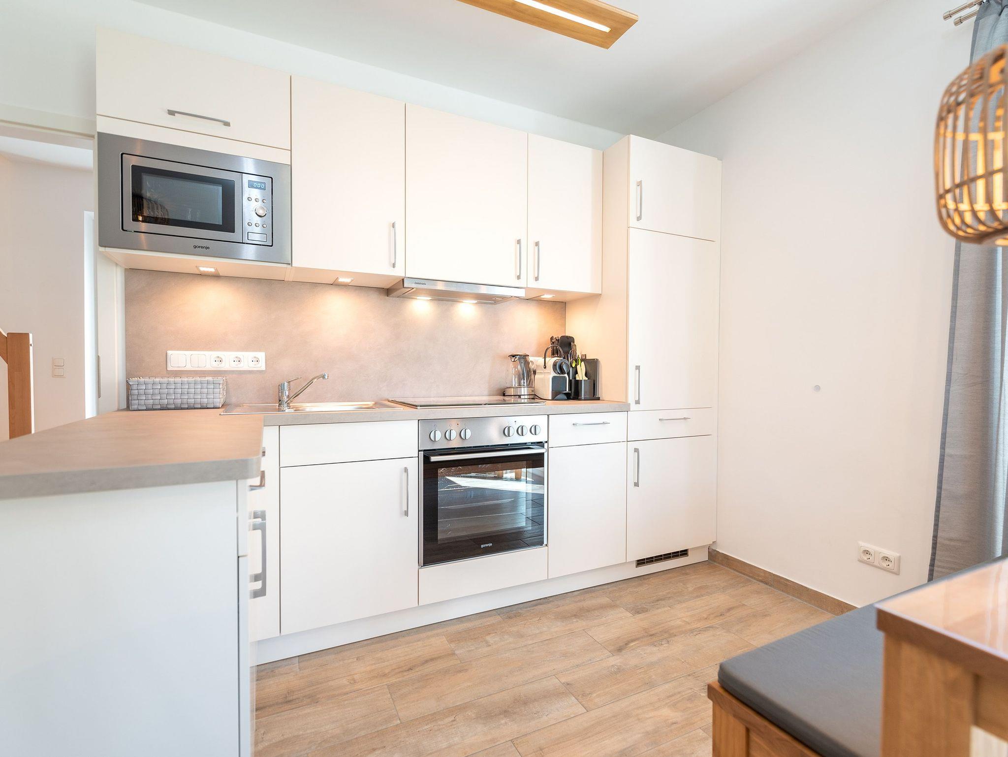 • Eine voll ausgestattete Küche, einschließlich Mikrowelle, Backofen, Elektroherd, Kühlschrank sowie einer Nespresso-Kapselmaschine, Filterkaffeemaschine und French Press.