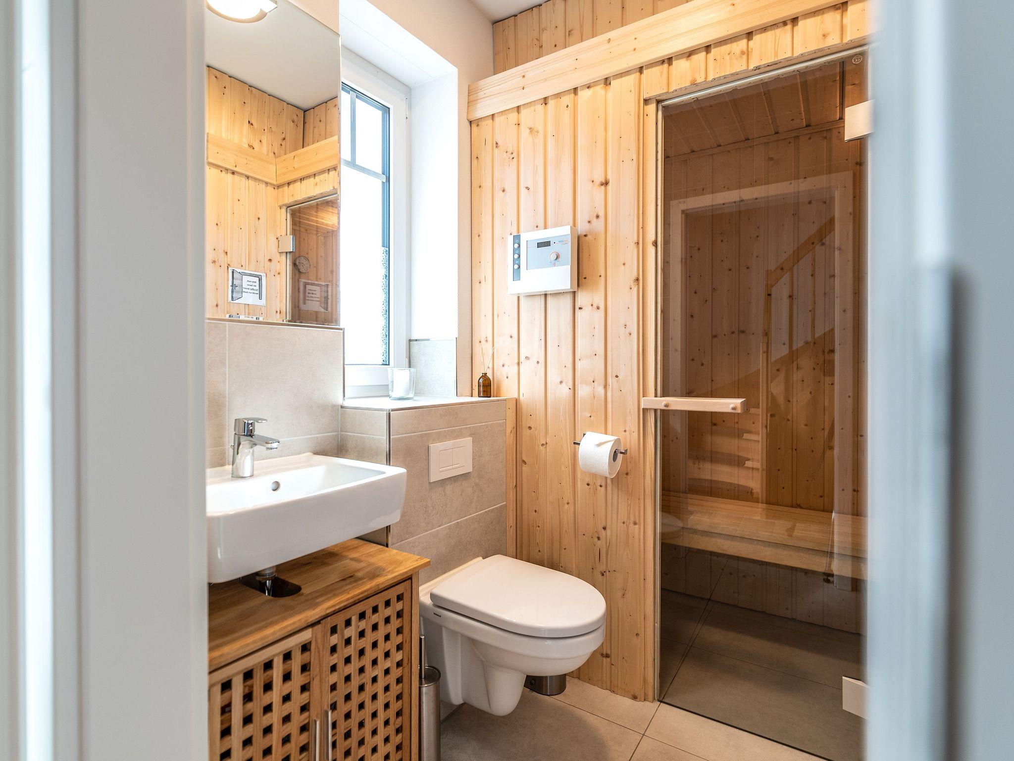 • Zwei Badezimmer, eines im Erdgeschoss mit Sauna, Dusche und WC, und ein weiteres im Obergeschoss mit einer begehbaren Regendusche, WC und Waschmaschine.