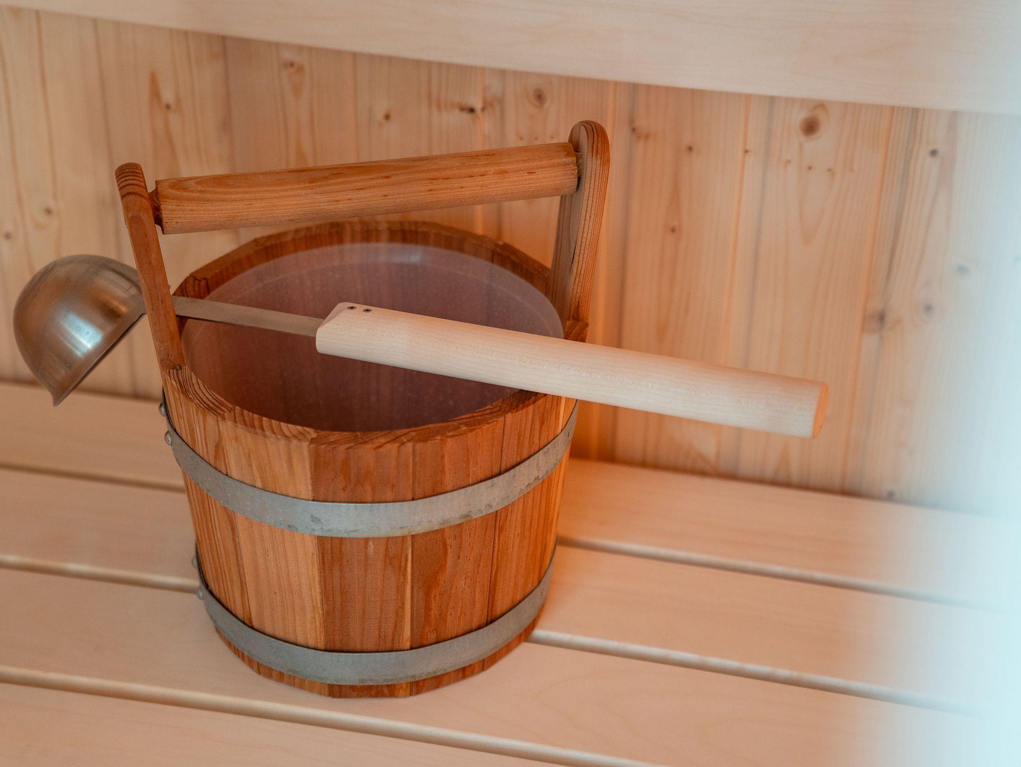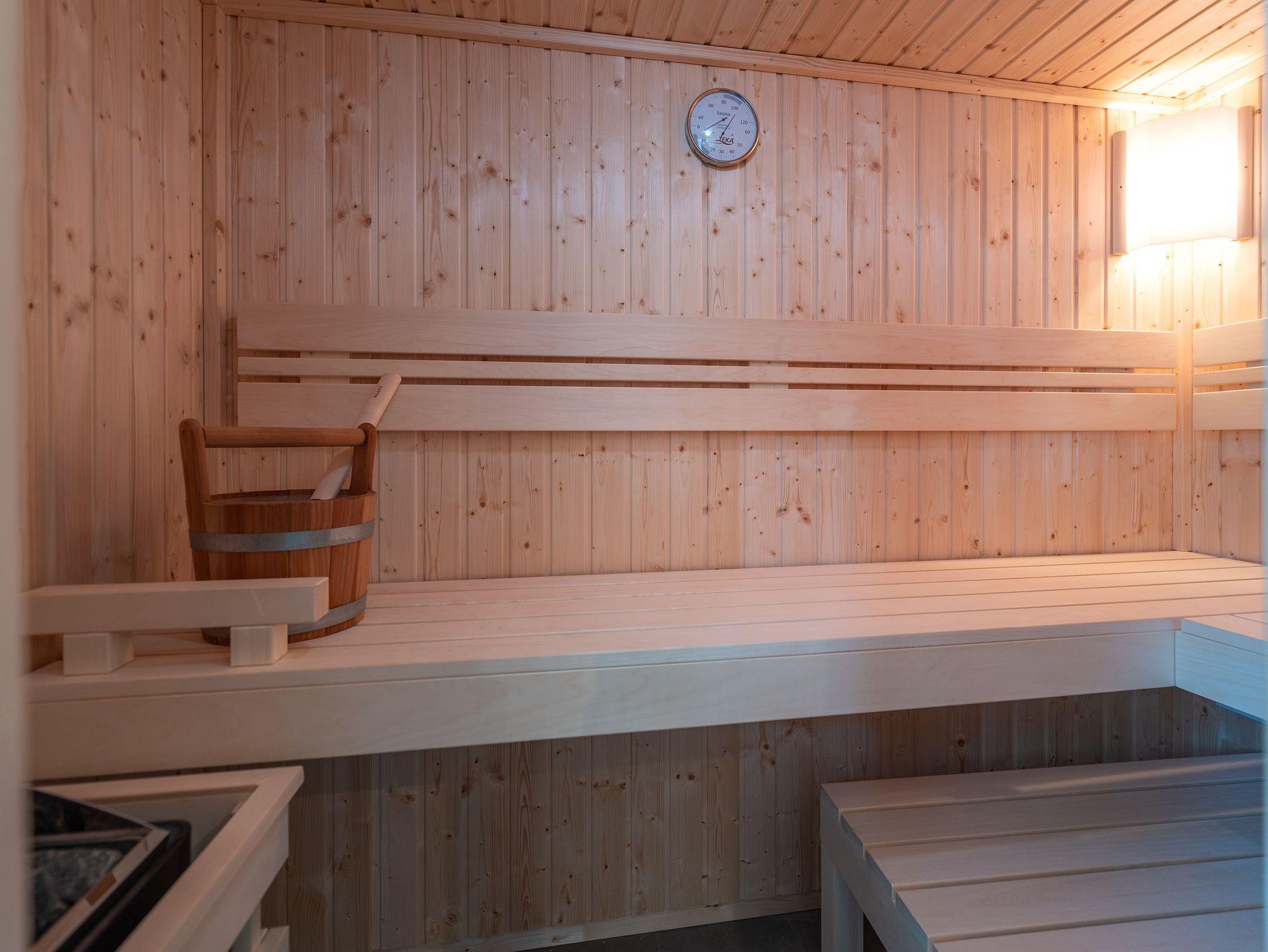 Zur weiteren Ausstattung gehören zwei großzügige Badezimmer: Das Badezimmer im Erdgeschoss verfügt über eine Sauna und eine Regendusche, während das Badezimmer im Obergeschoss mit einer Dusche und einer Badewanne ausgestattet ist.