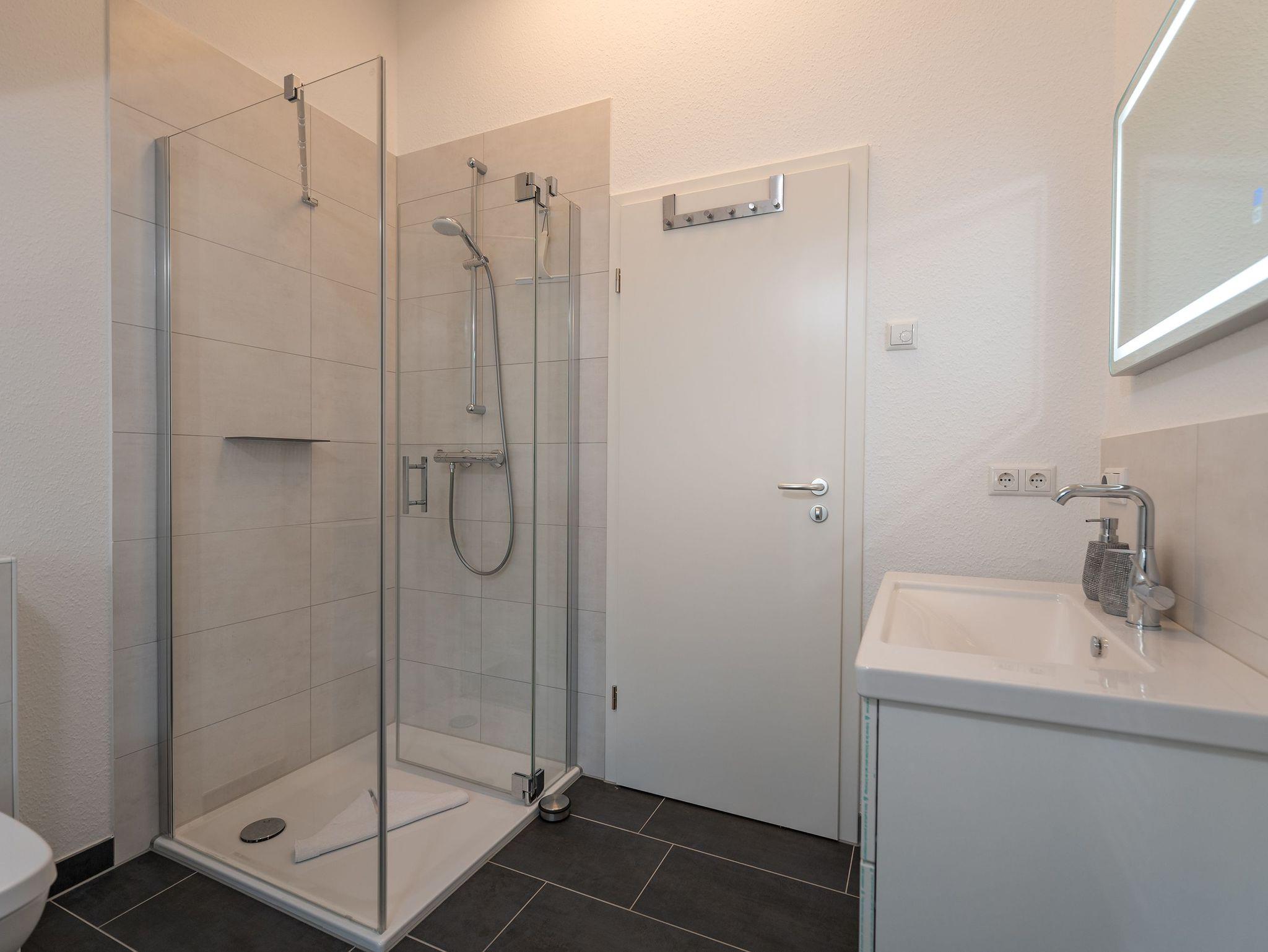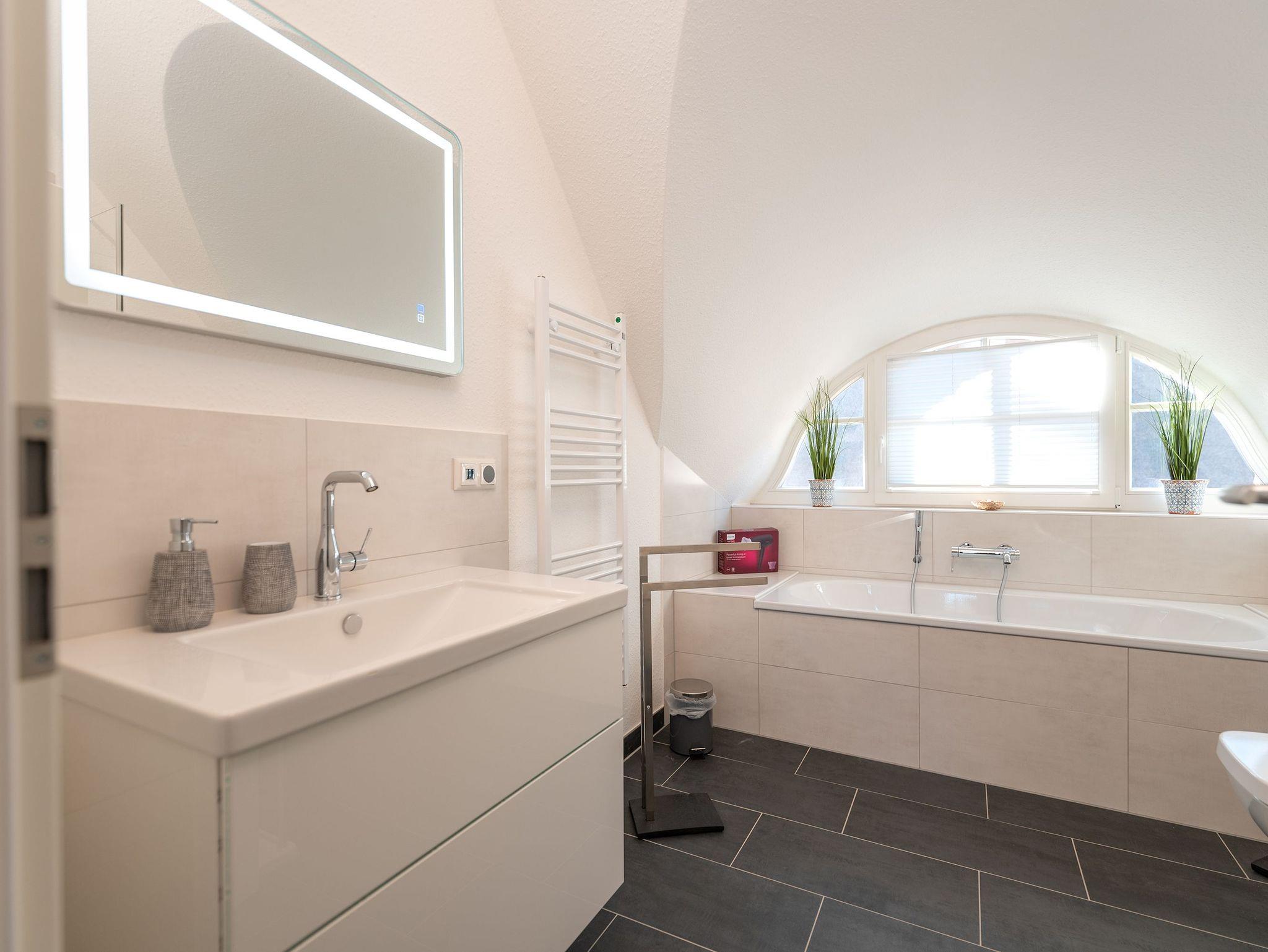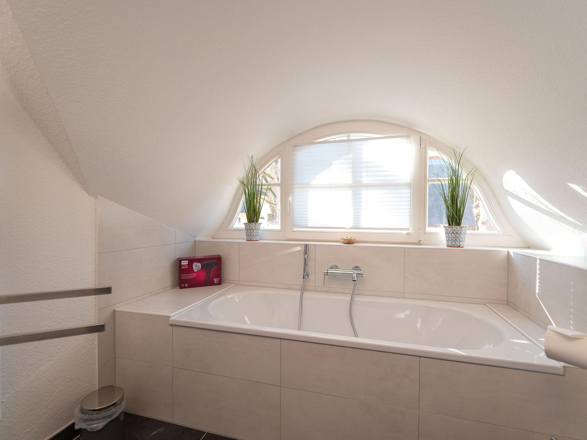 • großes Badezimmer mit Dusche und Badewanne (oben)