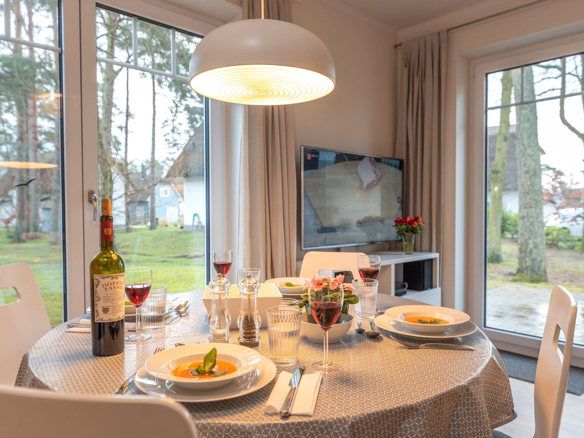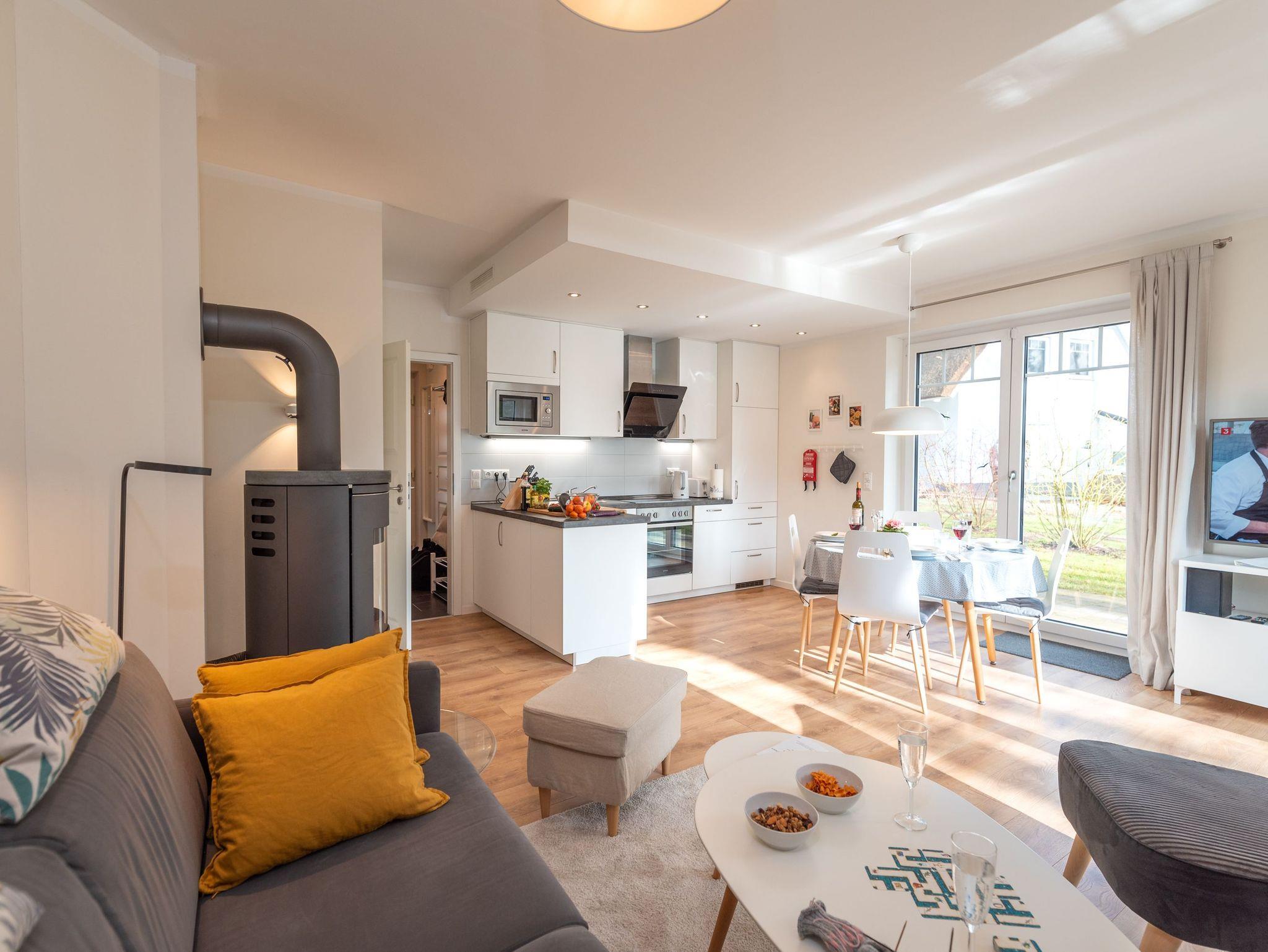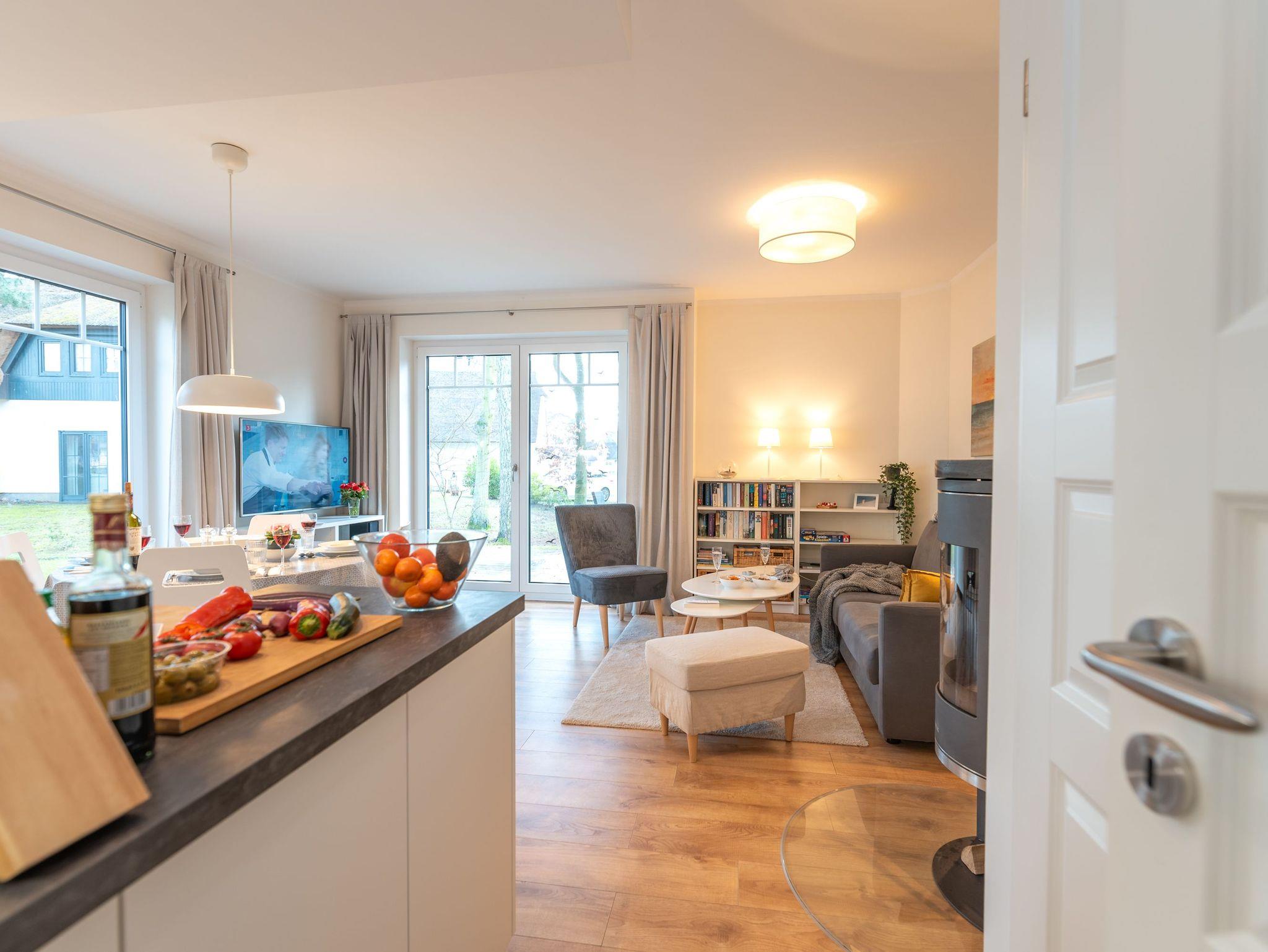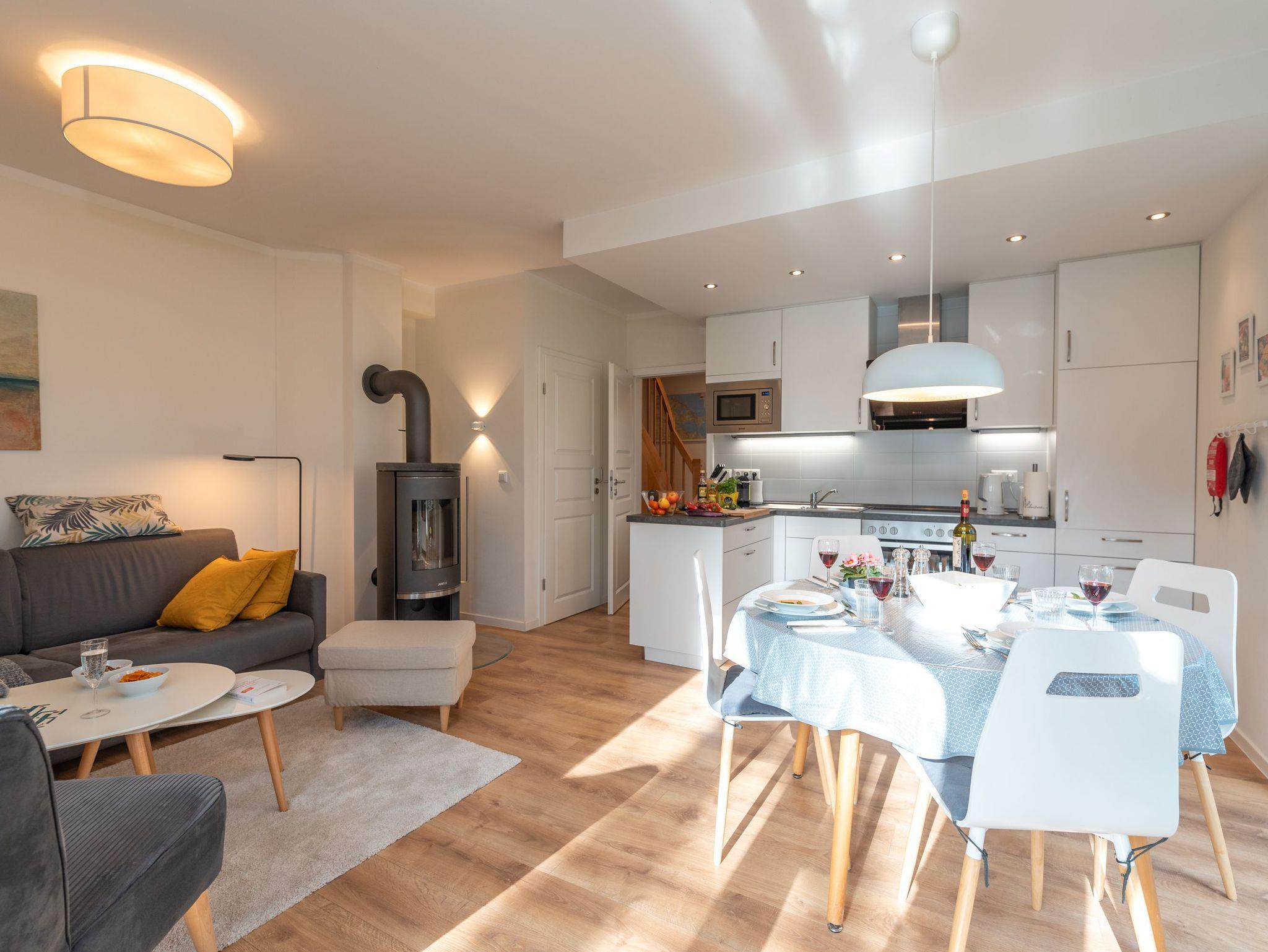 Im Erdgeschoss begru?ßt Sie zunächst ein kleiner Flur mit Garderobe, von dem aus eine Treppe ins Obergeschoss führt sowie ein kleines Bad mit Dusche und Sauna und der großzügige Wohn-Essbereich abgehen. Sofa und Sessel laden zum Entspannen vor dem Kamin oder zu gemütlichen Spieleabenden ein, auch für Leseratten ist gesorgt. Der Fernseher ist mit HDMI ausgestattet. Eine kleine Stereoanlage mit CD Player vervollständigt die Ausstattung. Die Einbauküche enthält alle Gegenstände, die zu einem ausgiebigen Frühstück oder zum Kochen der Mahlzeiten benötigt werden. Mikrowelle und Backofen sorgen fu?r eine schnelle Zubereitung der Gerichte, das kleine Tiefkühlfach für die Vorratshaltung. Die Spülmaschine kümmert sich um den Abwasch. So bleibt mehr Zeit für Muße, den Strand oder Ausflüge in die erlebnisreiche Umgebung.
