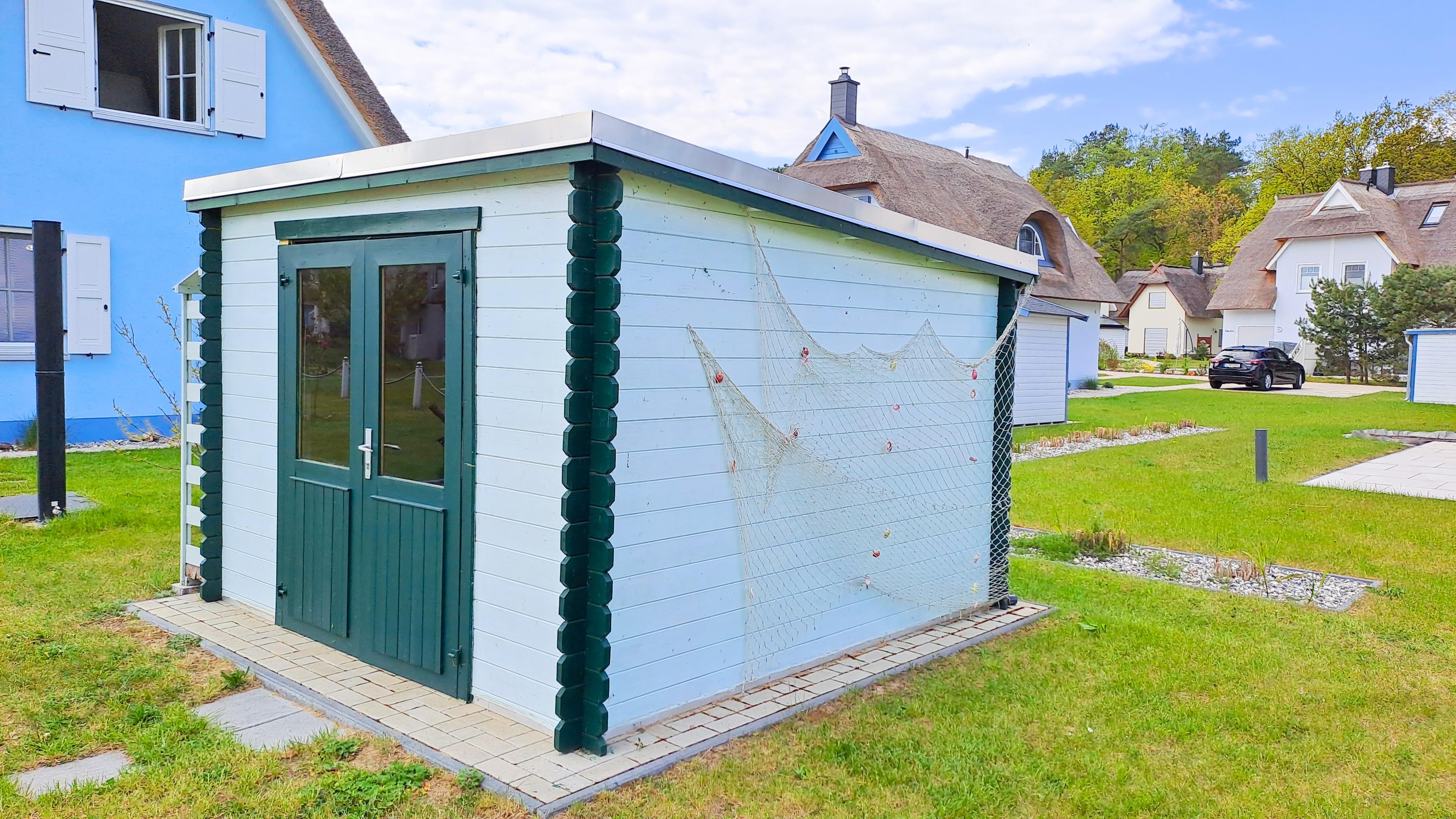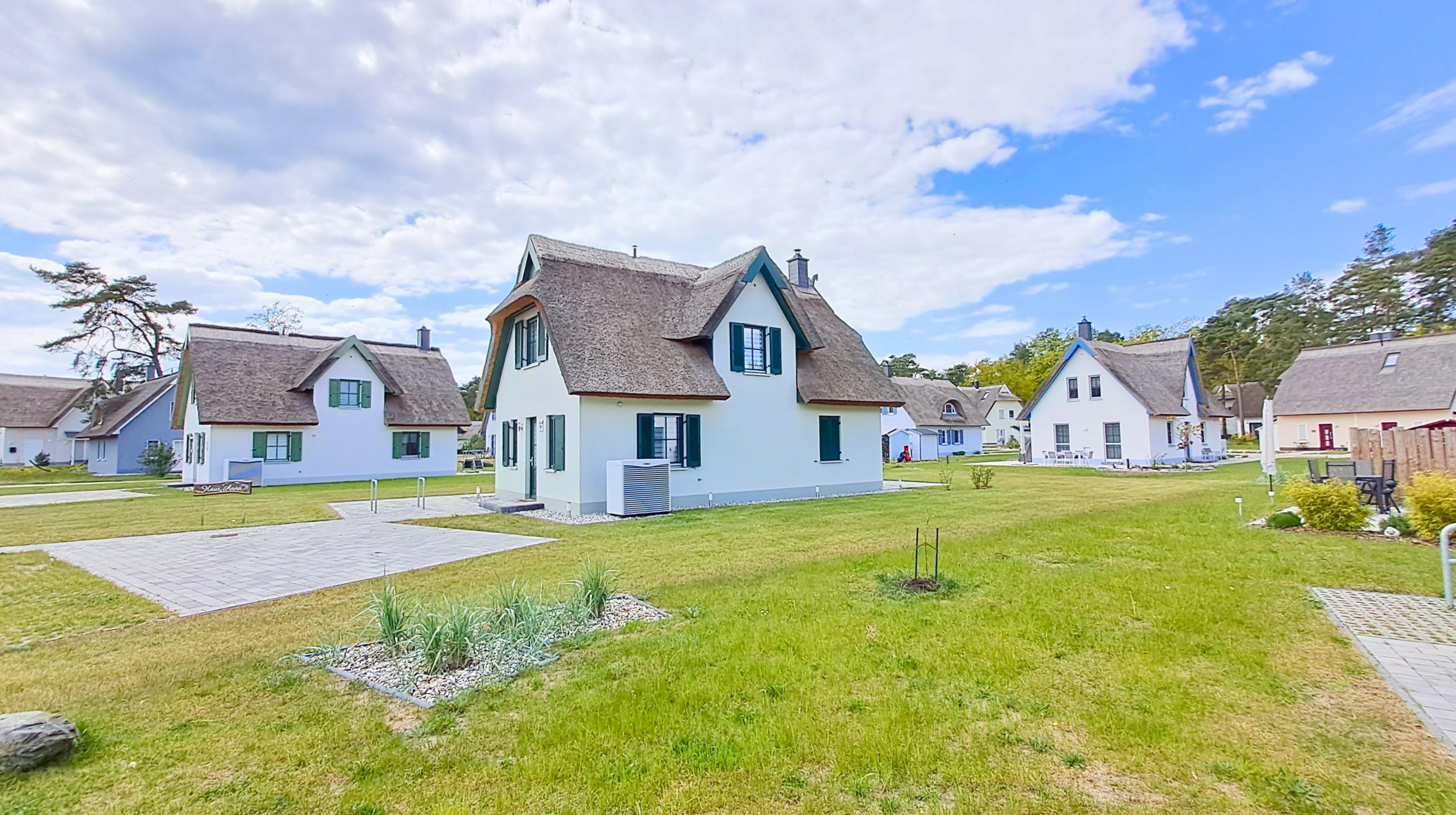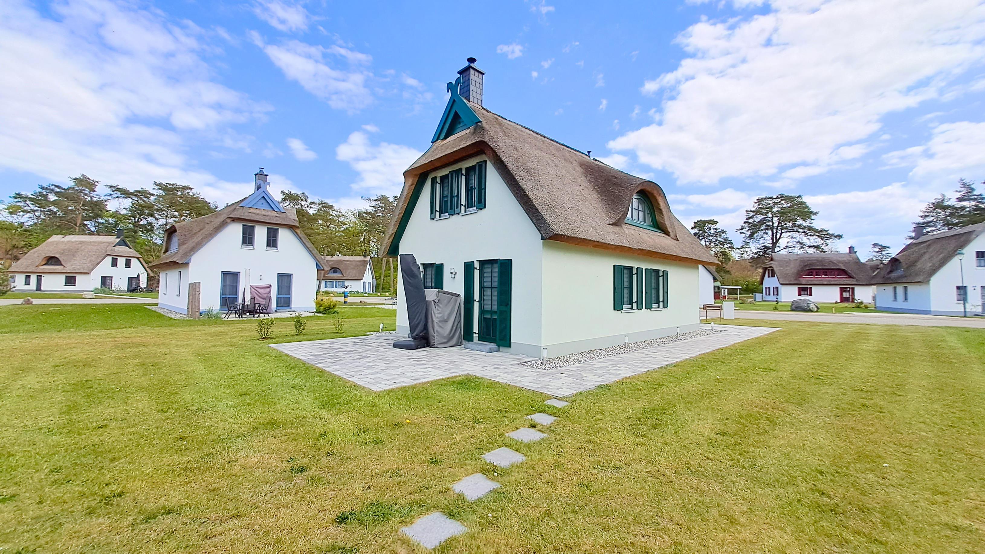 Ihr Ferienhaus fügt sich mit seinem ostseetypischen Reetdach perfekt in das neu errichtete Feriendorf ein. Zum Grundstück gehören ein Parkplatz, ein Fahrradschuppen (abschließbar) und Grünfläche. Auf der möblierten TERRASSE lassen Sie Ihren Urlaubstag bei einem Gläschen Wein und einem spannenden Buch ausklingen. Es darf gegrillt werden (Holzkohlegrill vorhanden).