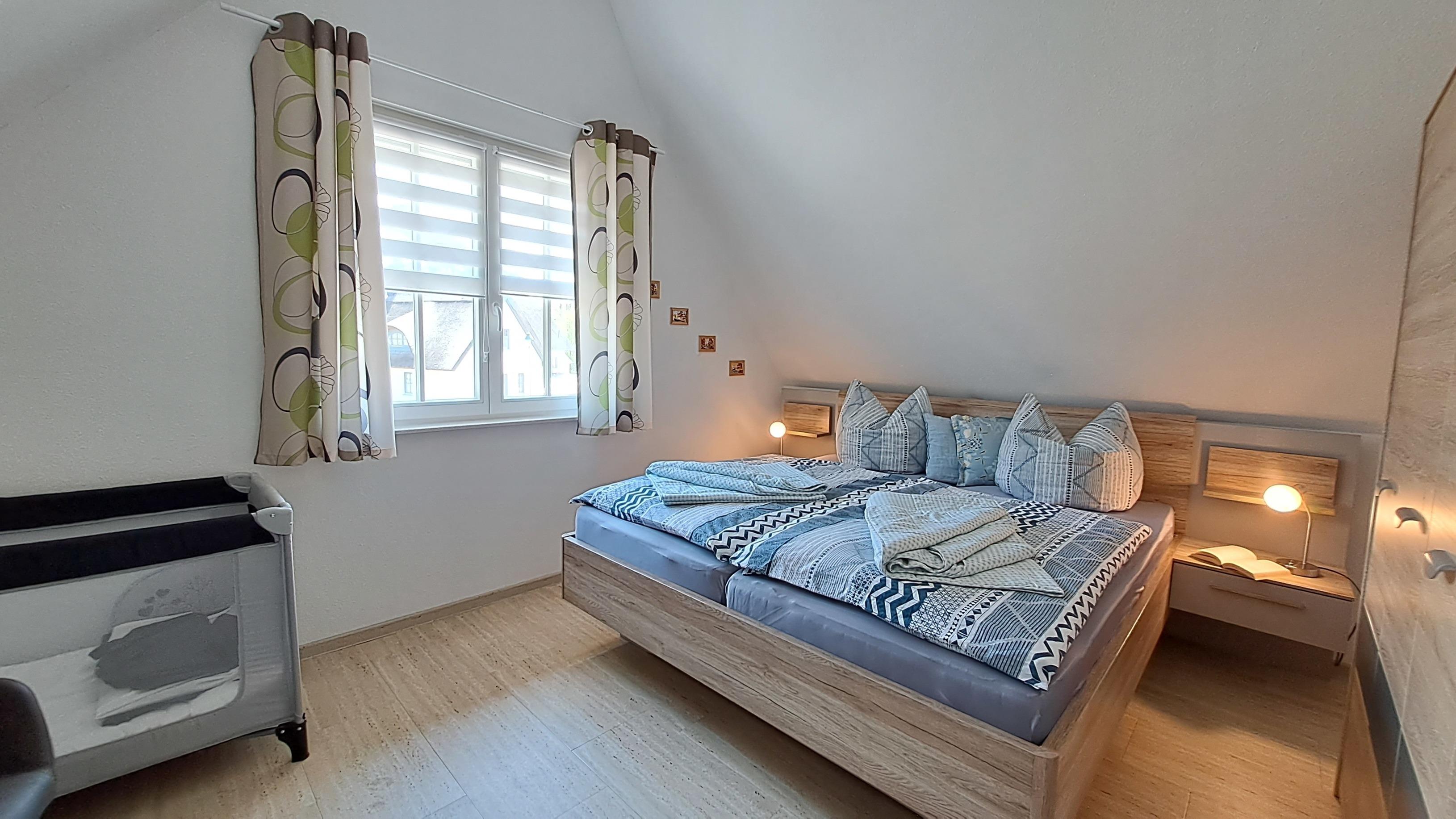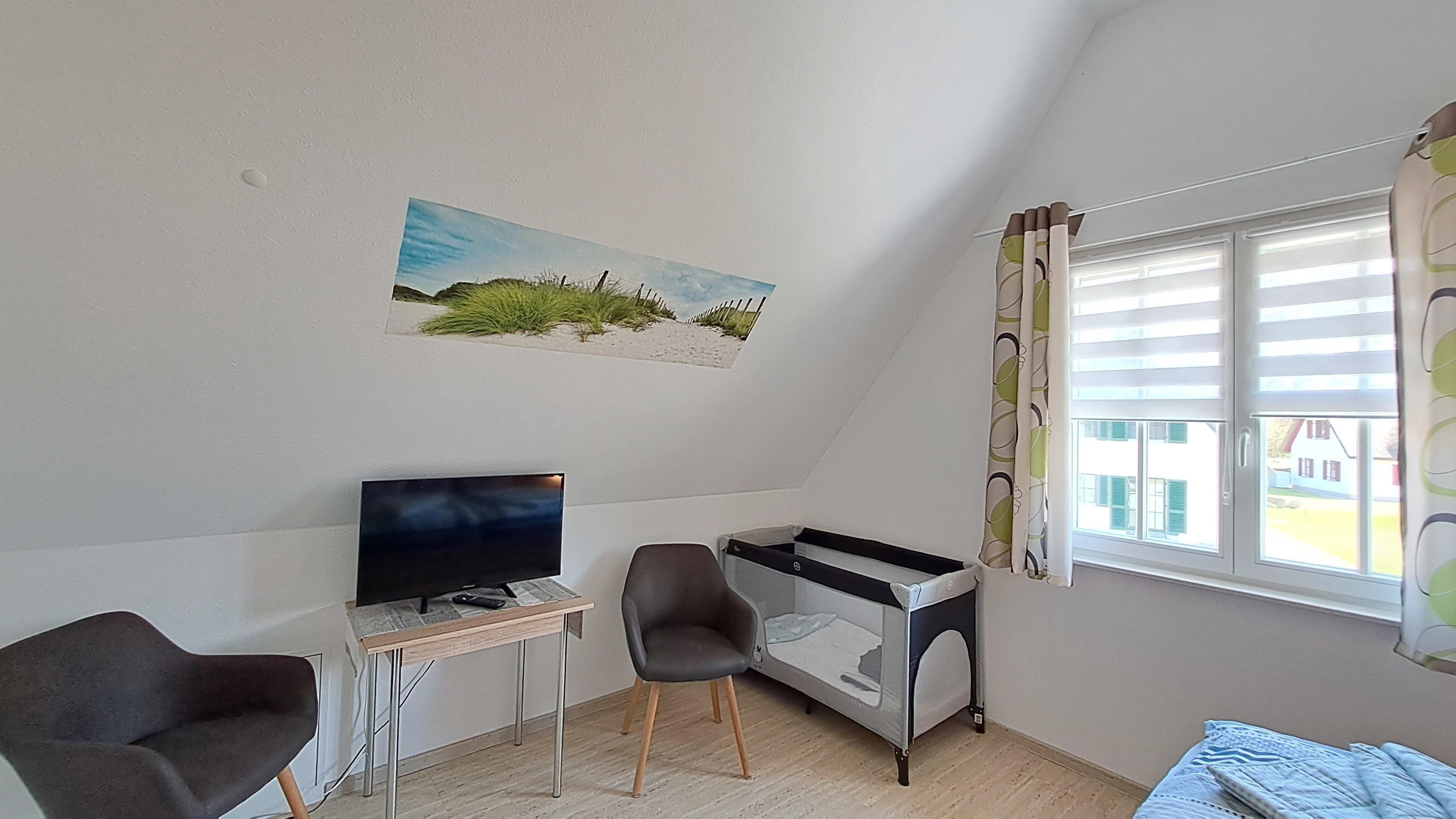 - Eines mit Doppelbett (180x200 cm), Kleiderschrank, Babyreisebett und Flachbild-TV
