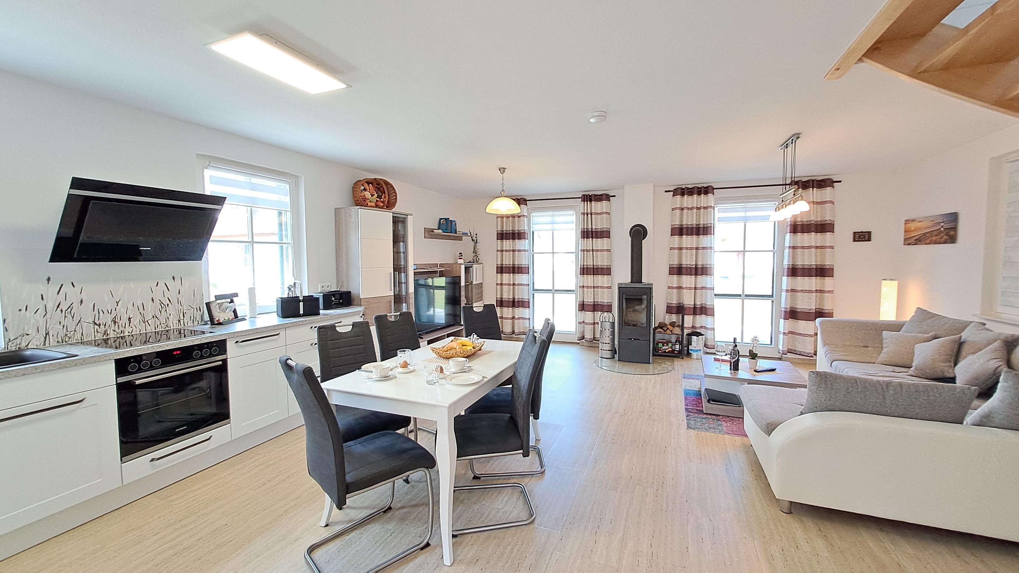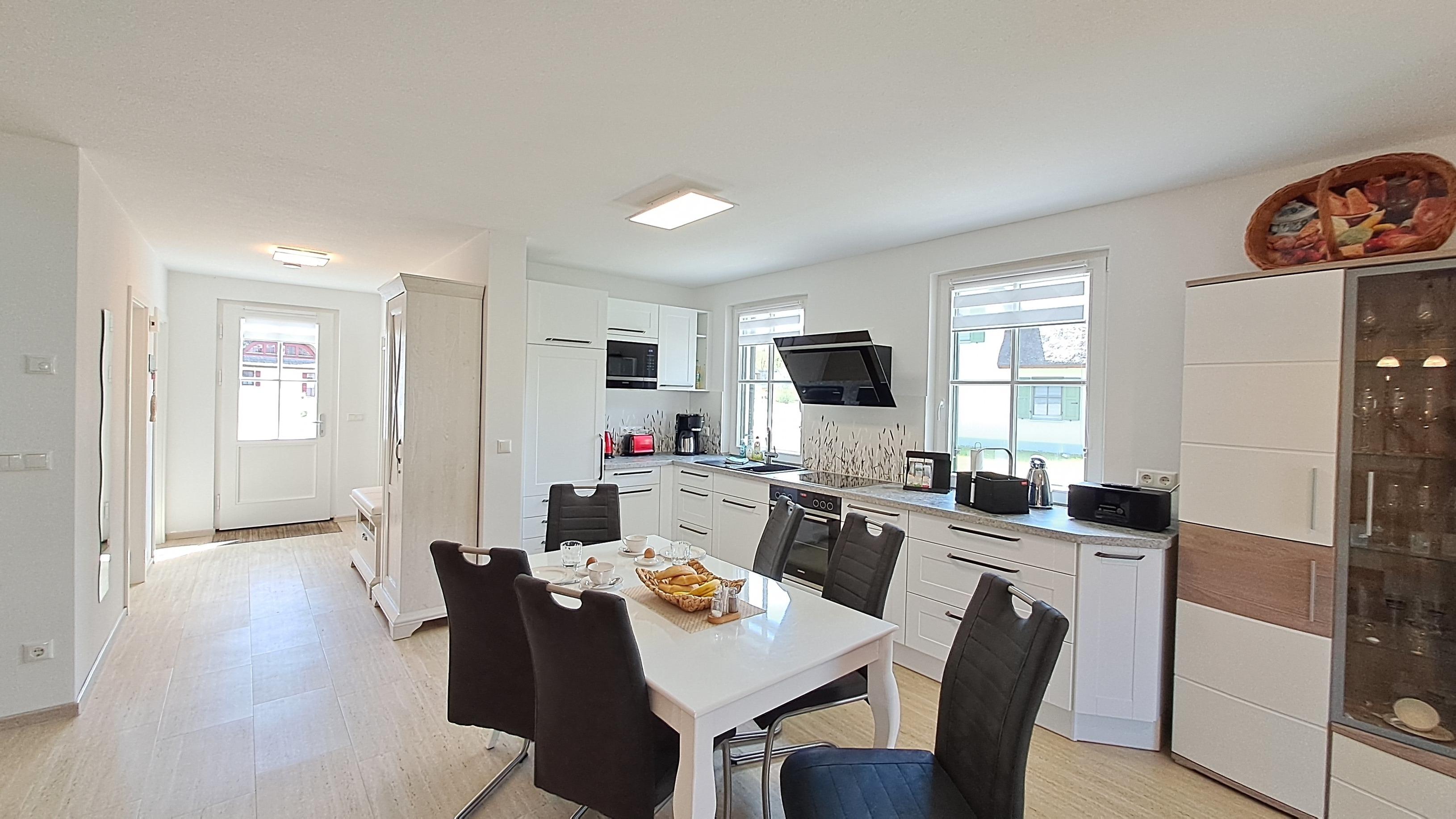 - Mit Backofen, Spülmaschine, 4er-Cerankochfeld, Kühlschrank mit Gefrierfach, Kaffeemaschine, Wasserkocher, Toaster und vielen weiteren Küchenutensilien