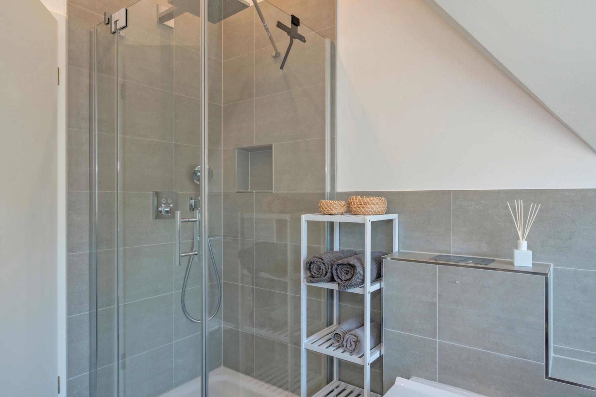 Die Regendusche, ein Waschbecken mit Unterschrank für Ihre Kosmetik, sowie ein Hotelföhn, runden die moderne und komfortable Ausstattung ab.