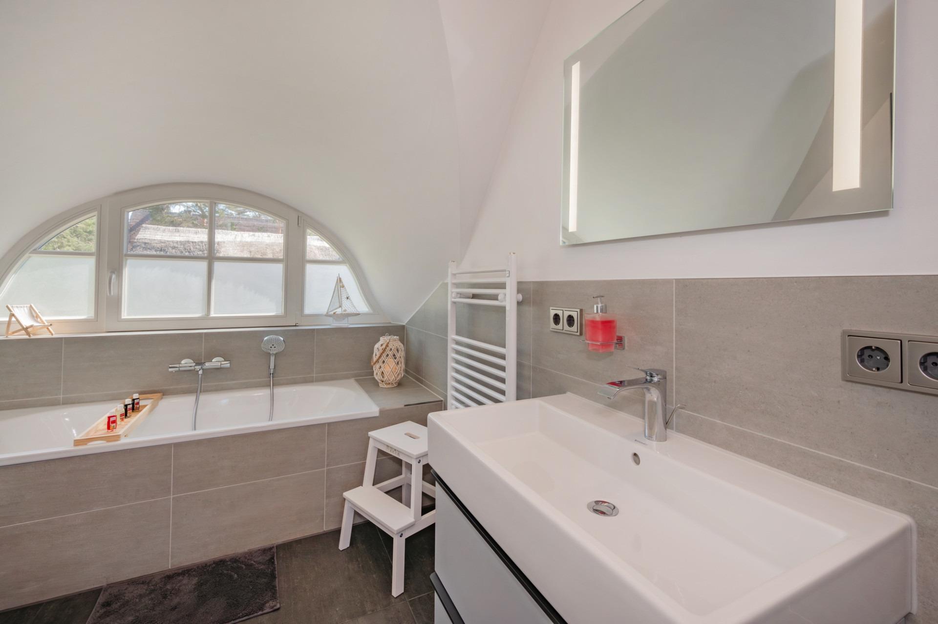 Zudem erwartet Sie im Obergeschoss ein wunderschönes Tageslichtbad mit einer unter der Fledermausgaube perfekt platzierten Badewanne für zwei - für einzigartige Entspannungsmomente unter Reet.