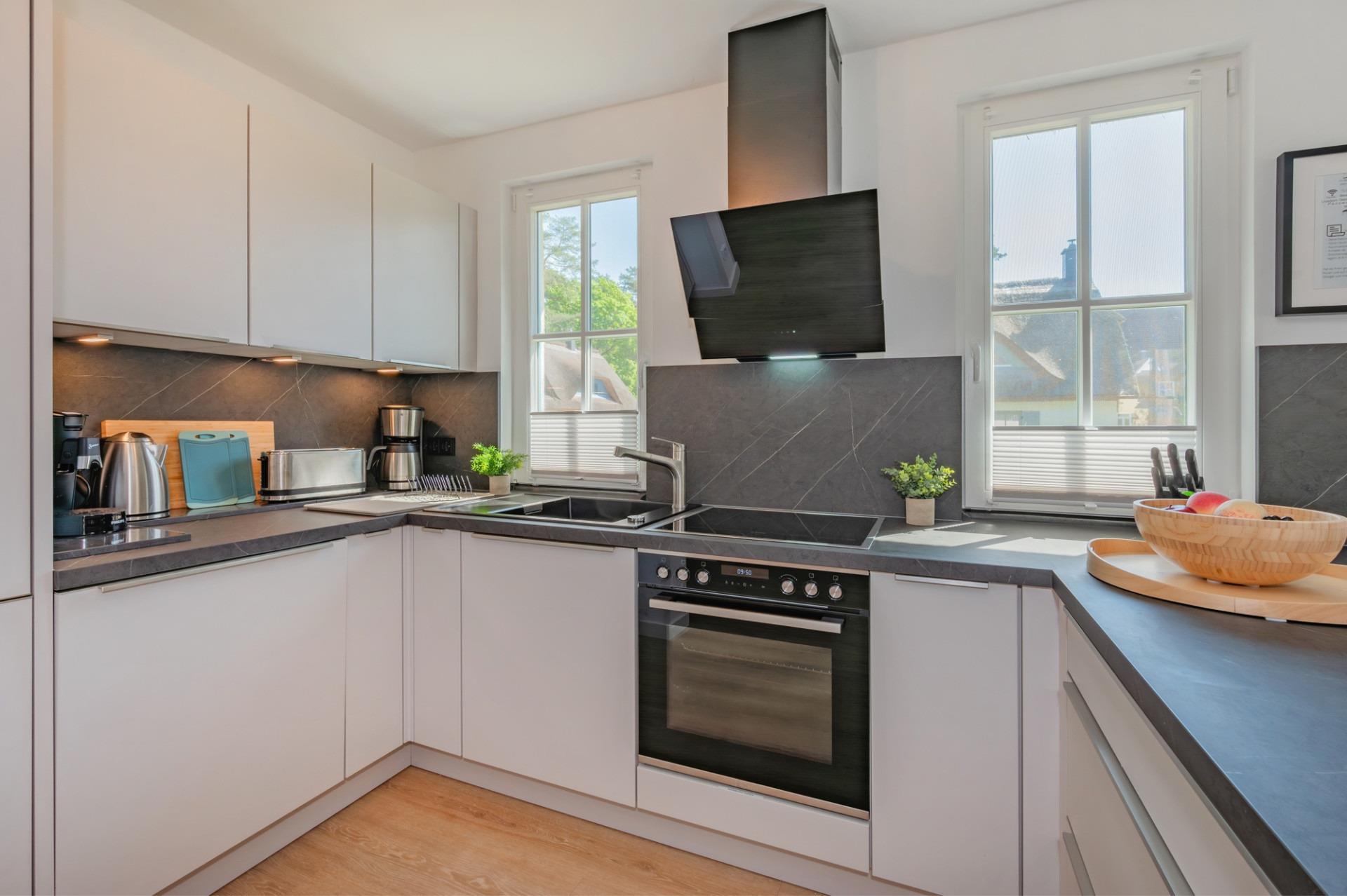 In der modernen Designerküche findet man alles, was man im Urlaub benötigt: Geschirrspüler, Filterkaffeemaschine, Senseo-Padmaschine, Toaster und Wasserkocher, sowie Induktionskochfeld, Töpfe, Gläser, Geschirr und Besteck.