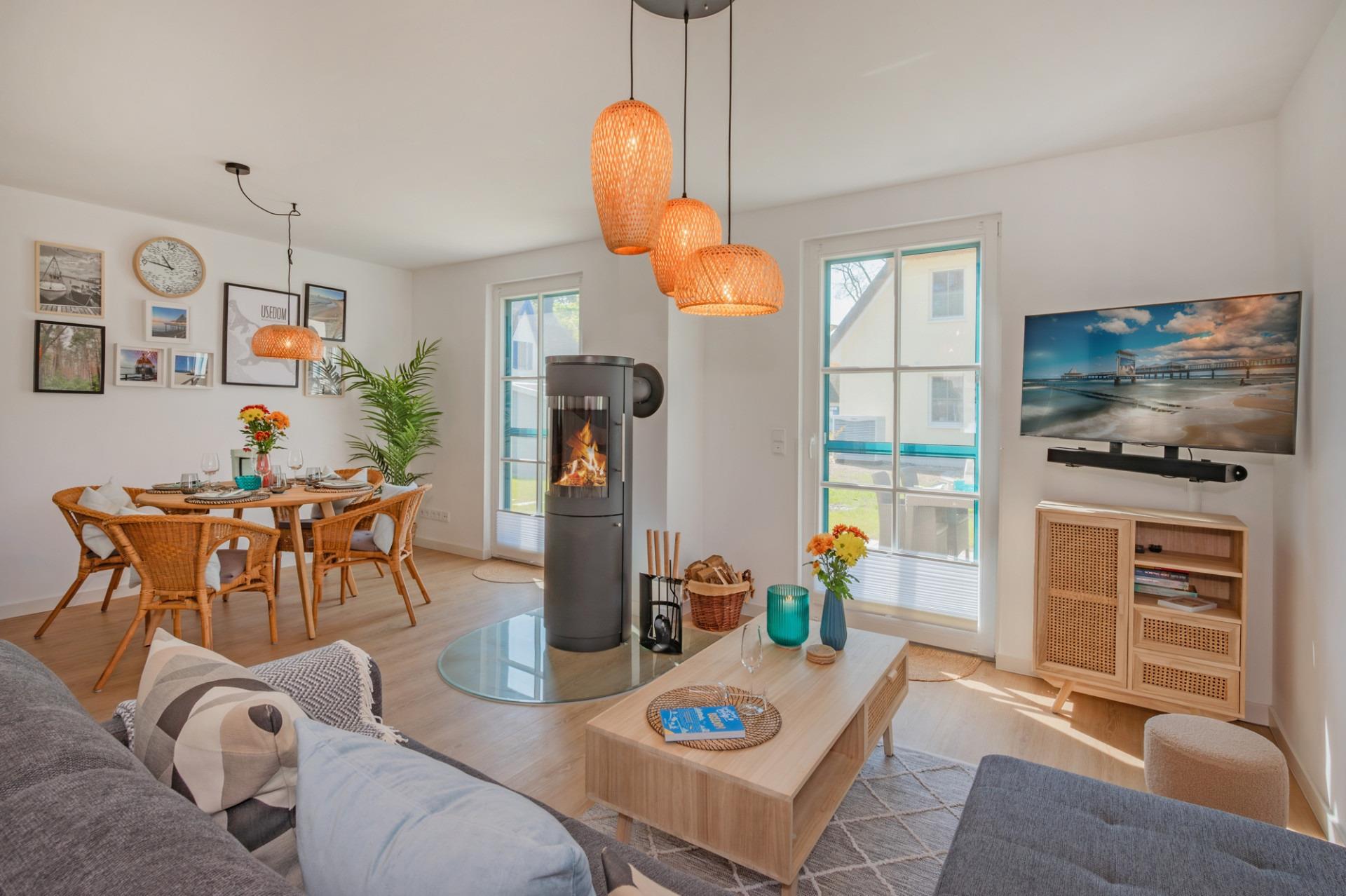 Der großzügig kombinierte Wohn- und Essbereich führt Sie direkt zur Terrasse, auf der Sie die Sonnenstunden Usedoms genießen können. Die Terrasse ist mit Sitzmöbeln, Sonnenliegen, Sonnenschirm und einem Gasgrill (April-Oktober) ausgestattet.
