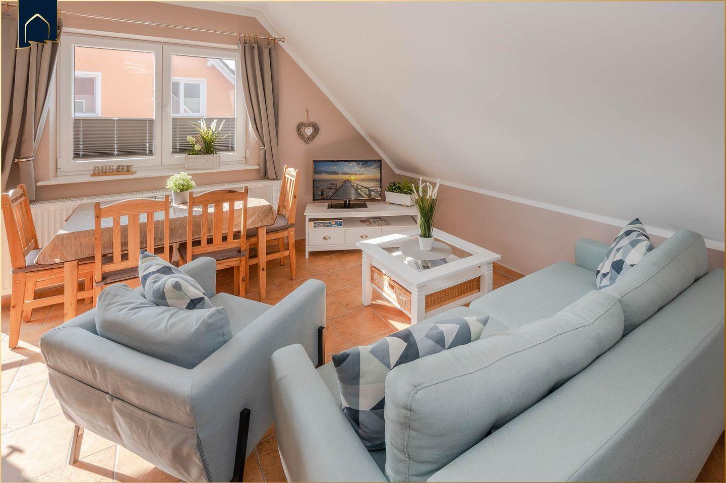 Die rund 50?m² große, lichtdurchflutete Ferienwohnung bietet den perfekten Rückzugsort für Familien, Paare oder Freunde, die Ruhe und Komfort inmitten der Natur schätzen. Sie liegt in einem ruhigen Dorf auf Usedom, nur wenige Minuten von See, Strand und Einkaufsmöglichkeiten entfernt. Ein heller Wohnbereich mit gemütlicher Sofaecke und zwei modernen TVs sorgt für entspannte Stunden – ob nach dem Strandtag oder einem Ausflug in die Natur. Für angenehme Temperaturen zu jeder Jahreszeit sorgt eine Fußbodenheizung. WLAN ist selbstverständlich vorhanden.