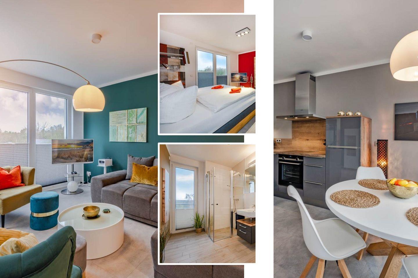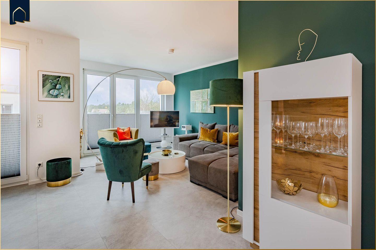 Die Ferienwohnung Ein Traum am Haff bietet auf 75 m² modernen Komfort mit offenem Wohn- und Essbereich, voll ausgestatteter Küche, einem Schlafzimmer, bodengleicher Dusche und zwei großen TVs. Entspannen Sie auf dem Balkon mit Garten- und eingeschränktem Seeblick, nutzen Sie die hauseigene Sauna und genießen Sie zahlreiche Freizeitmöglichkeiten in ruhiger Lage. Ein Privatparkplatz sowie Aufzug und WLAN stehen zur Verfügung.