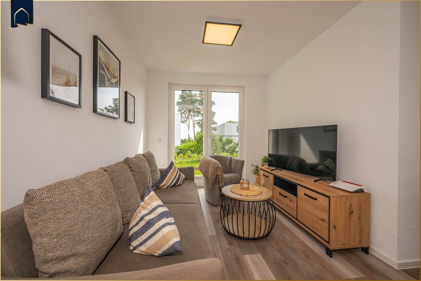 Das helle Wohnzimmer mit Sofaecke, TV (2 Geräte), Esstisch und offener Küche schafft eine gemütliche Atmosphäre. Die Küche ist komplett ausgestattet mit Backofen, Herd, Kühlschrank, Gefrierfach, Spülmaschine, Toaster, Wasserkocher und Kaffeemaschine – ideal für gemeinsames Kochen. Ein Schlafzimmer mit bequemen Schlafmöglichkeiten für bis zu vier Personen sorgt für erholsamen Schlaf. Das moderne Badezimmer verfügt über Dusche, WC und Kosmetikspiegel.