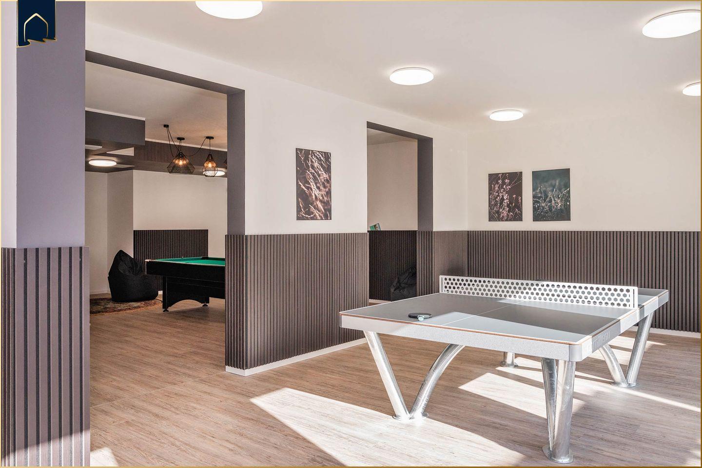 Ein Highlight der Ferienwohnung ist der eigene Wellnessbereich mit Sauna, Solarium und Ruheraum – perfekt für entspannte Stunden nach einem aktiven Tag. Für Spiel und Spaß stehen Ihnen Airhockey, Darts, Tischtennis, Billard und ein Kicker zur Verfügung – ein Paradies für Kinder und Junggebliebene!