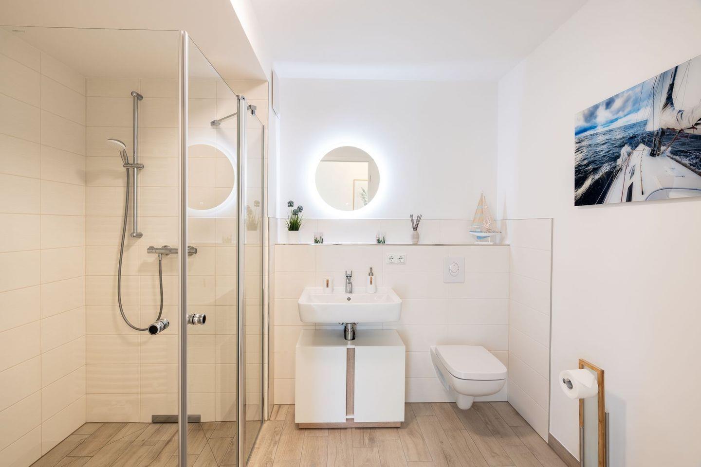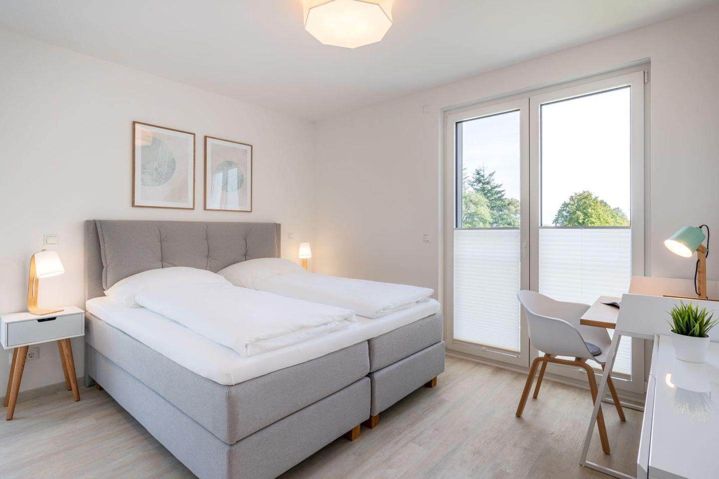 Die beiden Schlafzimmer sind ein Ort der Ruhe und Entspannung. Das komfortable Bett verspricht erholsame Nächte, und die großen Fenster lassen Sie den Wald und das Haff auch vom Bett aus bewundern. Die beiden Badezimmer sind modern und elegant gestaltet, mit einer geräumigen Dusche und allen Annehmlichkeiten, die Sie benötigen.