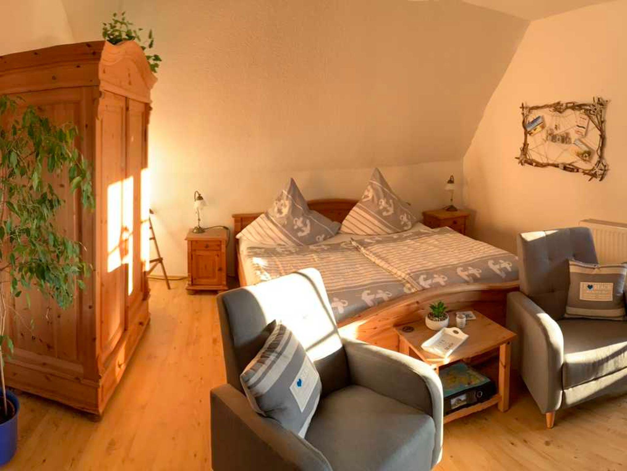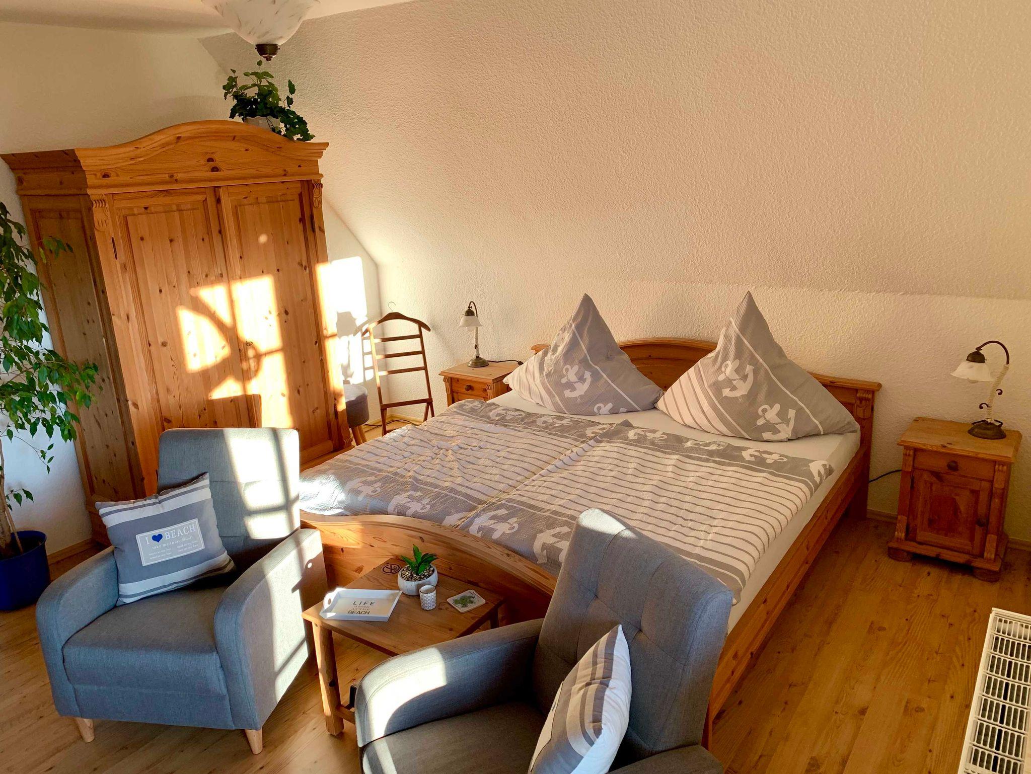 Unsere 40m² geräumige Ferienwohnung ist in der oberen Etage eines reet gedeckten Einfamilienhauses