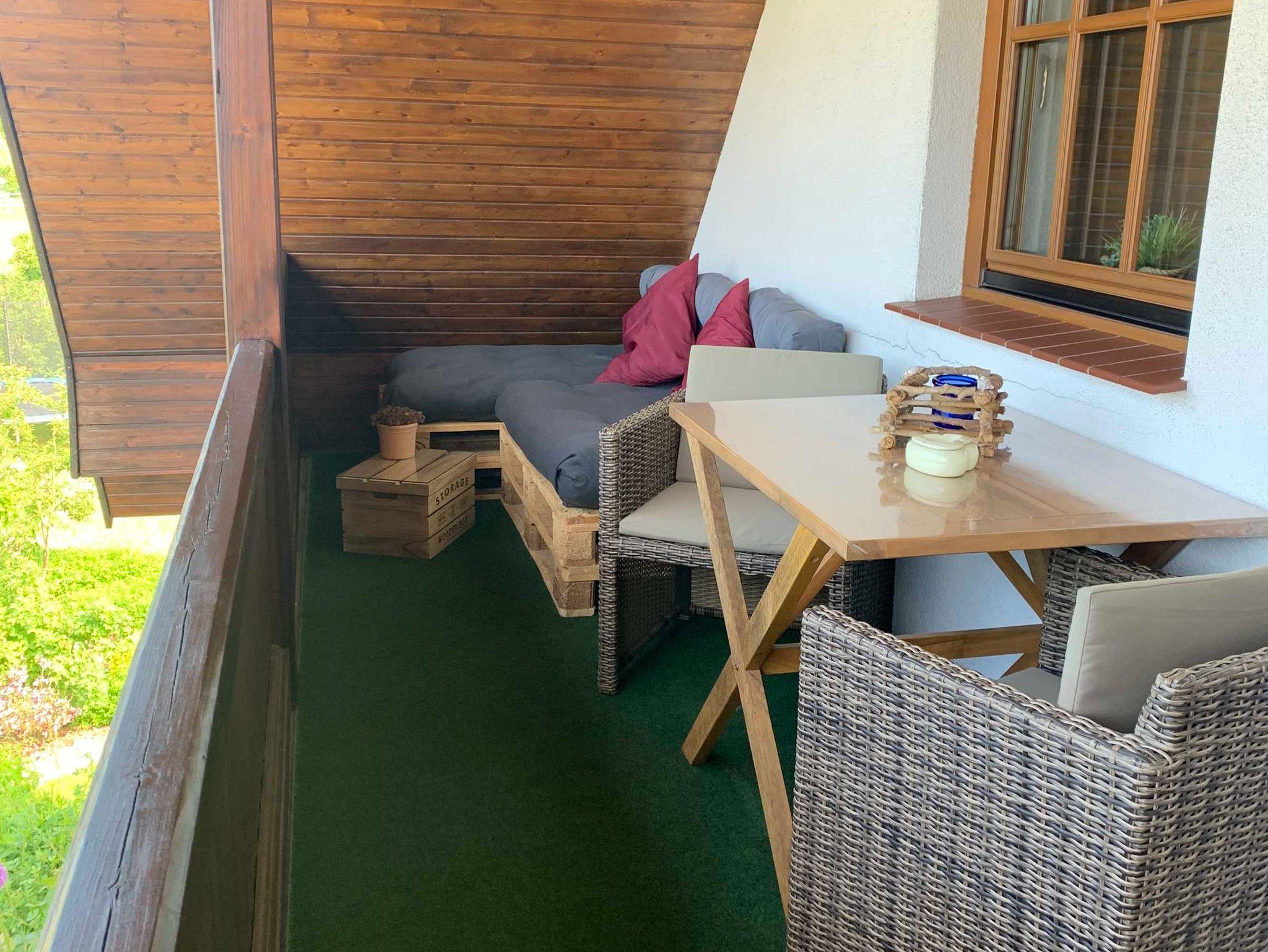 Nicht nur der große überdachte Balkon (möbliert) mit Blick auf unseren hübschen, selbst angelegte Koikarpfenteich , auch die gut ausgestattete Küche und dem anschließenden Wohn- Schlafraum lädt zum Erholen bei uns ein.