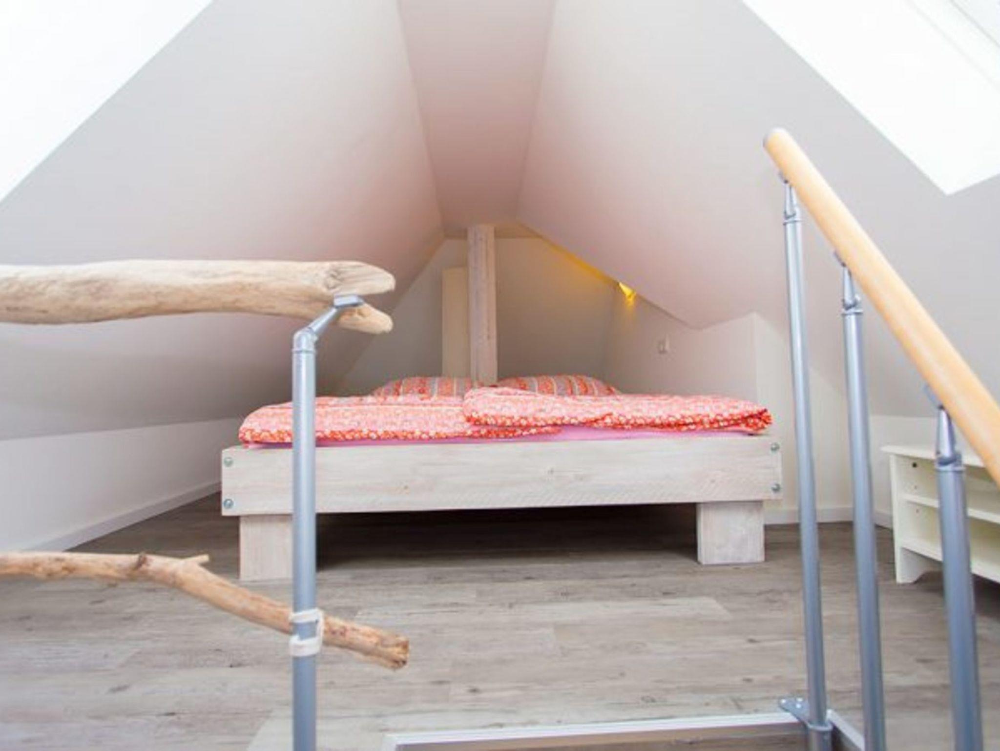 Ein Schlafbereich befindet sich optisch durch einen Wandvorsprung getrennt vom Wohnbereich. Hier stehen zwei Einzelbetten.Über eine Raumspartreppe gelangt man in das im Dachgeschoss liegende Schlafzimmer, welches mit einem bequemen Doppelbett ausgestattet ist. Das Bad verfügt über eine Dusche, WC und Waschtisch. Bettwäsche und Handtücher sind bei Ihrer Anreise selbstverständlich inklusive.