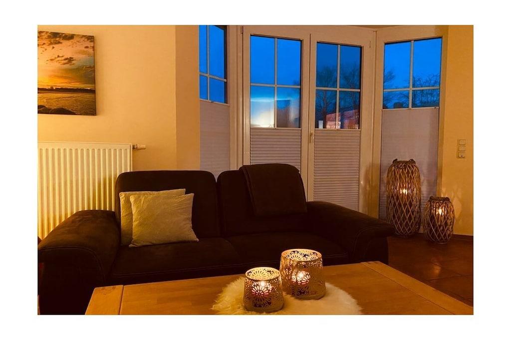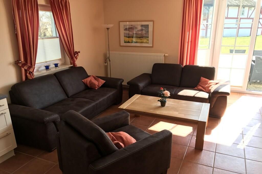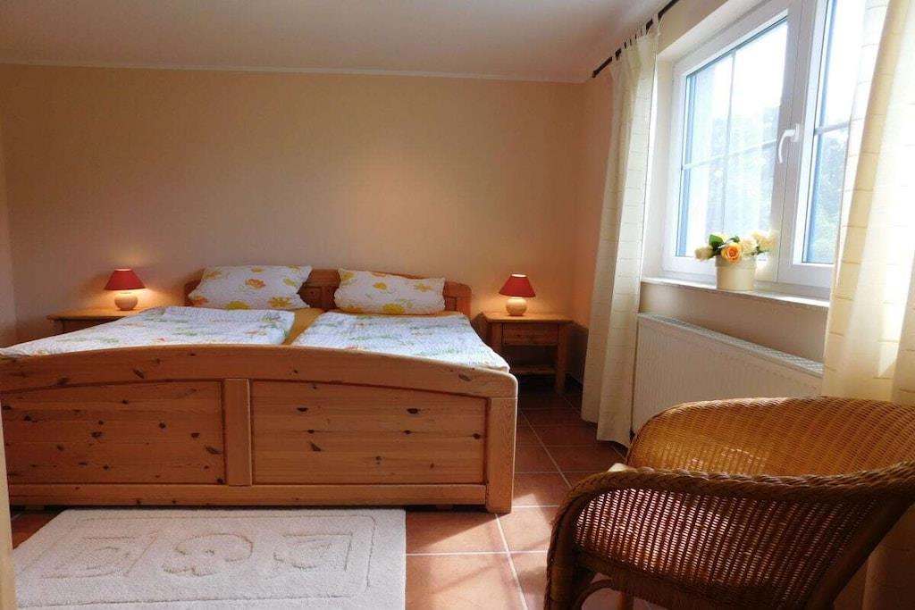 Komfortables, gemütliches Ferienhaus mit 1050 m² Grundstück im verträumten und beschaulichen Ort Zudar im Süden von Rügen gelegen. Unsere Doppelhaushälfte ist mit ca. 110 m² sehr großzügig geschnitten, modern eingerichtet und bietet im Obergeschoss mit 2 Schlafzimmern (je 1 Doppelbett) und 1 Schlafzimmer ( 1 Etagenbett) Platz für 6 Personen. Zusätzlich bieten wir 1 Kinderbett an. Die hauseigene Sauna (gegen Gebühr) und die idyllische, ruhige Lage lädt zum Relaxen und Entspannen ein. Hunde sind willkommen! Kostenloses WLAN und 2 TV ( 1 TV im Schlafzimmer) sind vorhanden. Waschmaschine und Trockner können ab Buchung von mind. 10 Tagen kostenlos genutzt werden.
