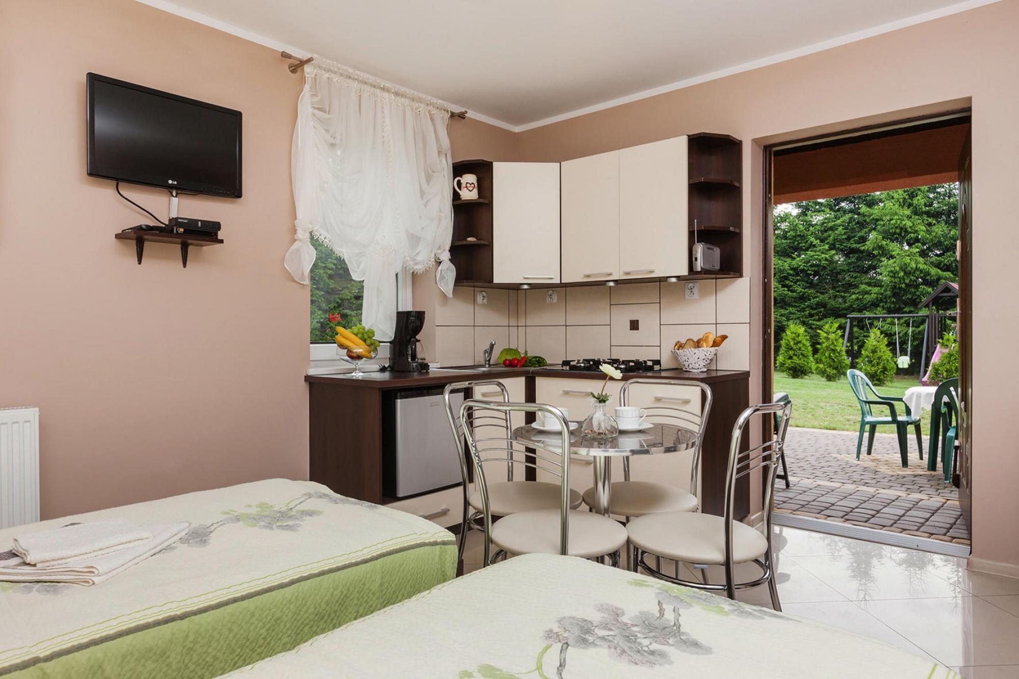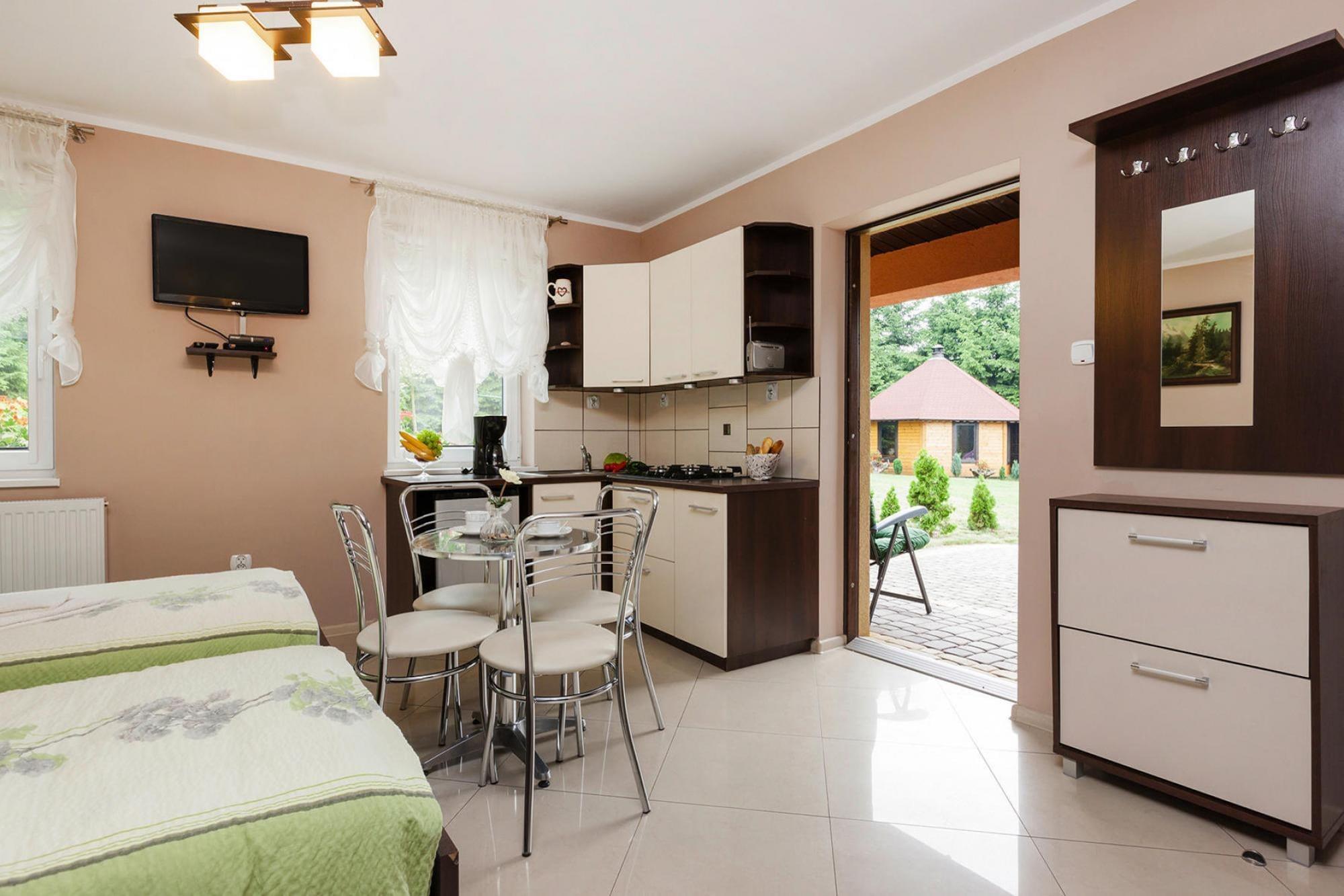 Zwei kleine, gepflegte und modern eingerichtete Doppelhaushälften mit eigener Terrasse und einem gemeinsamen, schön angelegten Gartengrundstück. Die Häuschen sind mit kostenfreiem WLAN sowie SAT-TV mit deutschen Programmen ausgestattet. Die Nähe zum Stettiner Haff, der Fluss Dziwna und die nur wenige Kilometer entfernte Ostsee bieten jede Menge Aktionsmöglichkeiten. Der Wolinski Nationalpark ist ein gutes Ausflugsziel. HighLights : WLAN Kurtaxe Aktivitäten in der Nähe : Das Wassersportangebot ist groß und auch Angler finden immer wieder ein ruhiges Plätzchen am Meer, See oder Stettiner Haff, um ihre Ruten auszuwerfen. In Ihrer Urlaubsplanung sollten Sie unbedingt einen Ausflug ins 12 km entfernte Miedzyzdroje einplanen: Die imposante Seebrücke, die Allee der Sterne, das illustre Wachsfigurenmuseum oder das Kliff, das den Aussichtspunkt Gosan beherbergt sind nur ein paar Highlights, die die Stadt zu bieten hat. In Wolin sollte ein Besuch des Wikingerdorfs auf Ihrem Plan stehen. Große und kleine Gäste werden begeistert sein. Eine wunderbare Aussicht hat man in Wolin vom landschaftlich attraktiven Galgenberg aus Mobilität : Nicht geeignet für Personen mit eingeschränkter Mobilität