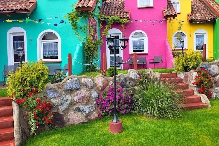 Ein kleines Küstendorf, 2,5 km vom Meer entfernt. Die Ferienanlage liegt eingebettet in endlose Wiesen. Diese gemütliche Ferienanlage im mexikanischen Stil bietet Unterkünfte in acht zweistöckigen Ferienhäusern, die farbenfrohen mexikanischen Dörfern nachempfunden sind. Jedes Haus verfügt im Erdgeschoss über ein Wohnzimmer (mit Fernseher, Tisch und Doppelschlafsofa), eine Küche und ein Badezimmer mit Dusche (inklusive Waschmaschine). Im Obergeschoss befinden sich zwei Doppelzimmer. Jedes Haus hat eine Terrasse mit Gartenmöbeln und Liegestühlen. WLAN ist verfügbar. Das gepflegte und umzäunte Gelände der Ferienanlage bietet einen Kinderspielplatz, sichere Parkplätze, einen Grillplatz und einen kleinen Pool (geöffnet im Juli und August). Fahrräder können kostenlos ausgeliehen werden, es wird jedoch eine Kaution erhoben. Im Sommer betreibt die Anlage einen Foodtruck mit köstlichen mexikanischen Spezialitäten. Im Preis inbegriffen: Bettwäsche, Strom, Wasser, Parkplatz, Internet, Fahrräder, Poolnutzung und Endreinigung. Ein Kinderbett und ein Hochstuhl sind auf Anfrage erhältlich. Der Strand ist 2,5 km entfernt und besticht neben der zweifellos malerischen Aussicht durch seine Gelassenheit, die selbst in der Hochsaison nicht zu überlaufen ist. Er ist auch bequem mit dem Fahrrad über einen der zahlreichen Radwege erreichbar, wobei man unterwegs nahegelegene Küstenorte entdecken kann. Kleinere, charmante Orte wie Poddabie und Orzechowo oder größere Badeorte wie Rowy (6 km) oder Ustka (13 km) mit einer großen Auswahl an guten Restaurants erwarten Sie. Überquert man in Rowy die Lupawa (Angeln ist hier erlaubt), erreicht man die Tore des Nationalparks (des drittgrößten in Polen). Zahlreiche Wanderwege führen zu den schönsten Sehenswürdigkeiten des Parks: dem Leuchtturm Czolpino, dem Auwald, den Wanderdünen, den Heidelandschaften, der Leuchtturmwärtersiedlung und Aussichtspunkten über den Gardno-See.