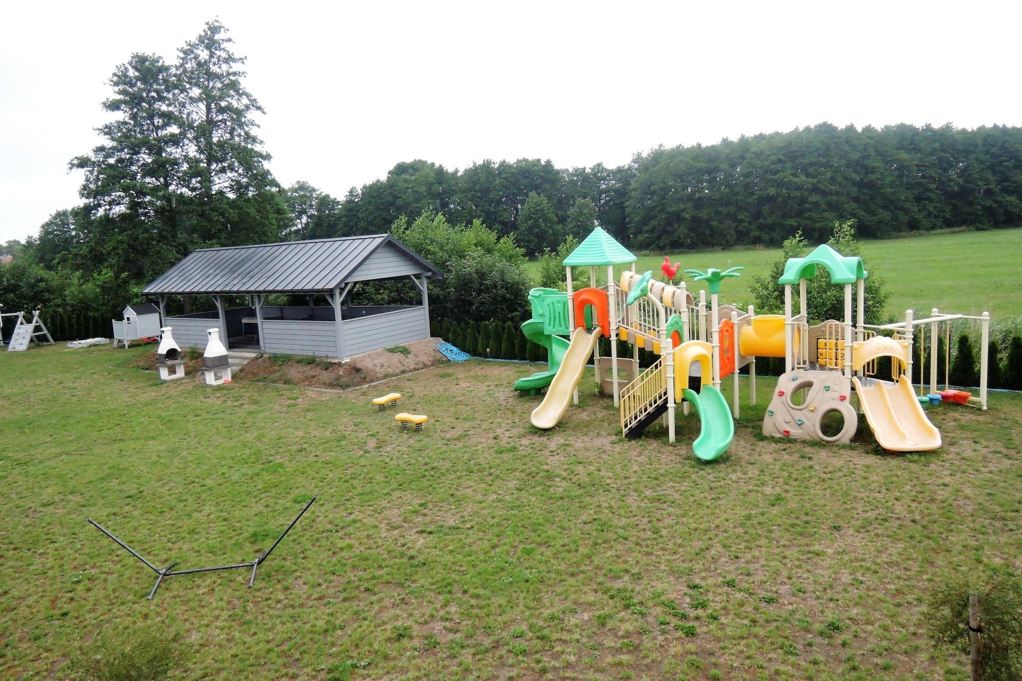 Parterre: (Kochnische(Wasserkocher, Kochherd(2 Kochplatten, elektrisch), Mikrowelle, Kühlschrank), Wohn-/Schlafzimmer(Einzelbett, Doppelschlafcouch, TV(Satellit, Deutsch Fernsehsender), Esstisch), Badezimmer(Dusche, Waschbecken, Toilette)) Terrasse, Garten(Gemeinschaftliche Nutzung mit anderen Gästen, umzäunt, angelegt, 3400 m2), Gartenmöbel, Grill, Sandkasten, Spielgeräte, Rutsche, Tischfußball, Hängematte, Gartenhaus