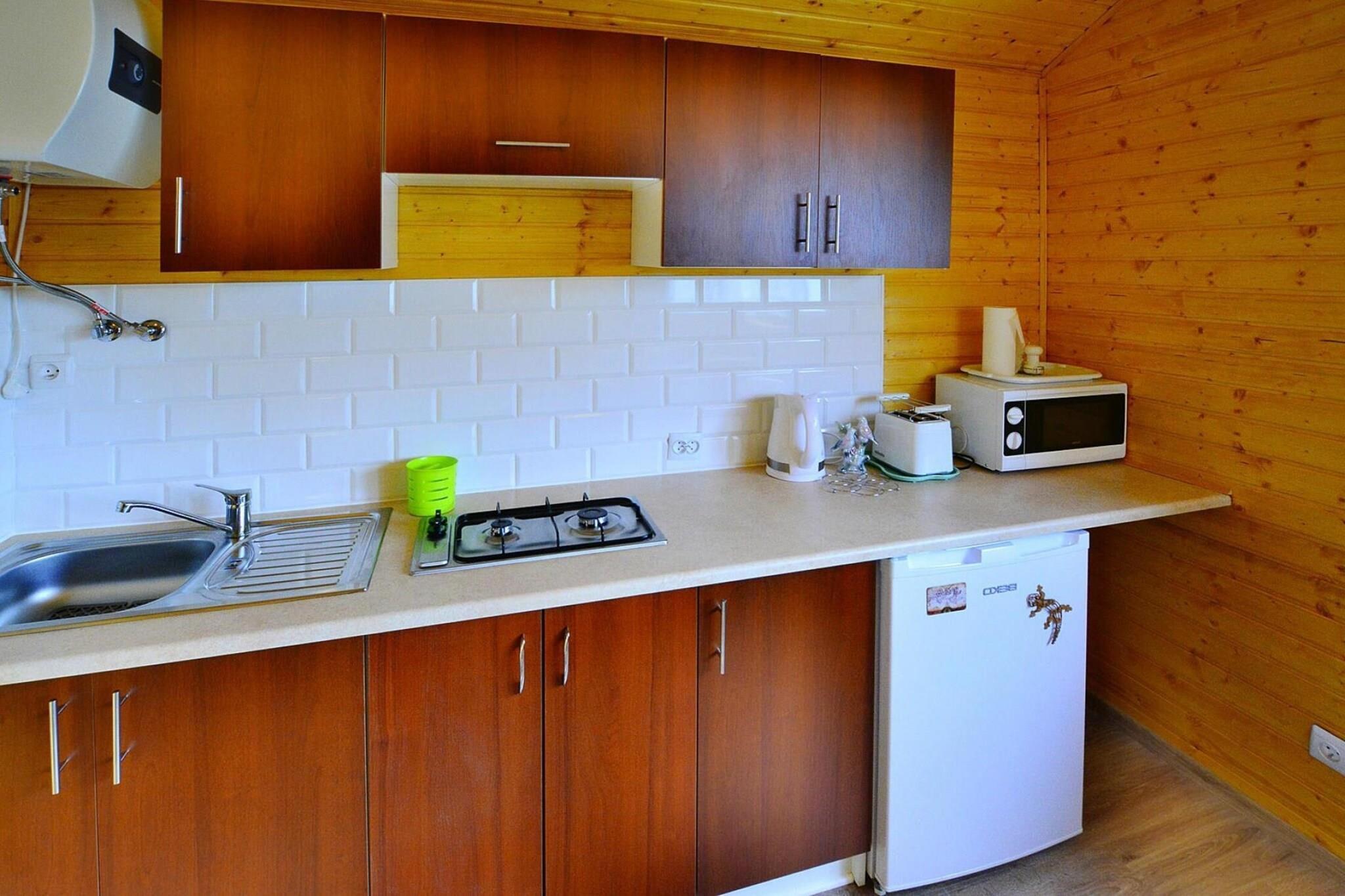 Parterre: (offene Küche(Kochplatte(2 Kochplatten, Gas), Wasserkocher, Toaster, Kühl-/Gefrierkombination), Wohn-/Schlafzimmer(Doppelschlafcouch, TV(Deutsch Fernsehsender), Esstisch, Radio), Schlafzimmer(Einzelbett, Etagenbett), Badezimmer(Dusche, Waschbecken, Toilette)) Rezeption, Internet, Liegewiese, Waschmaschine(Gemeinschaftliche Nutzung mit dem Eigentümer und anderen Gästen , gegen Gebühr), Terrasse(überdacht), Garten(Gemeinschaftliche Nutzung mit anderen Gästen, umzäunt, 3000 m2), Gartenmöbel, Liegen, Grill(Holzkohle), Parkplatz