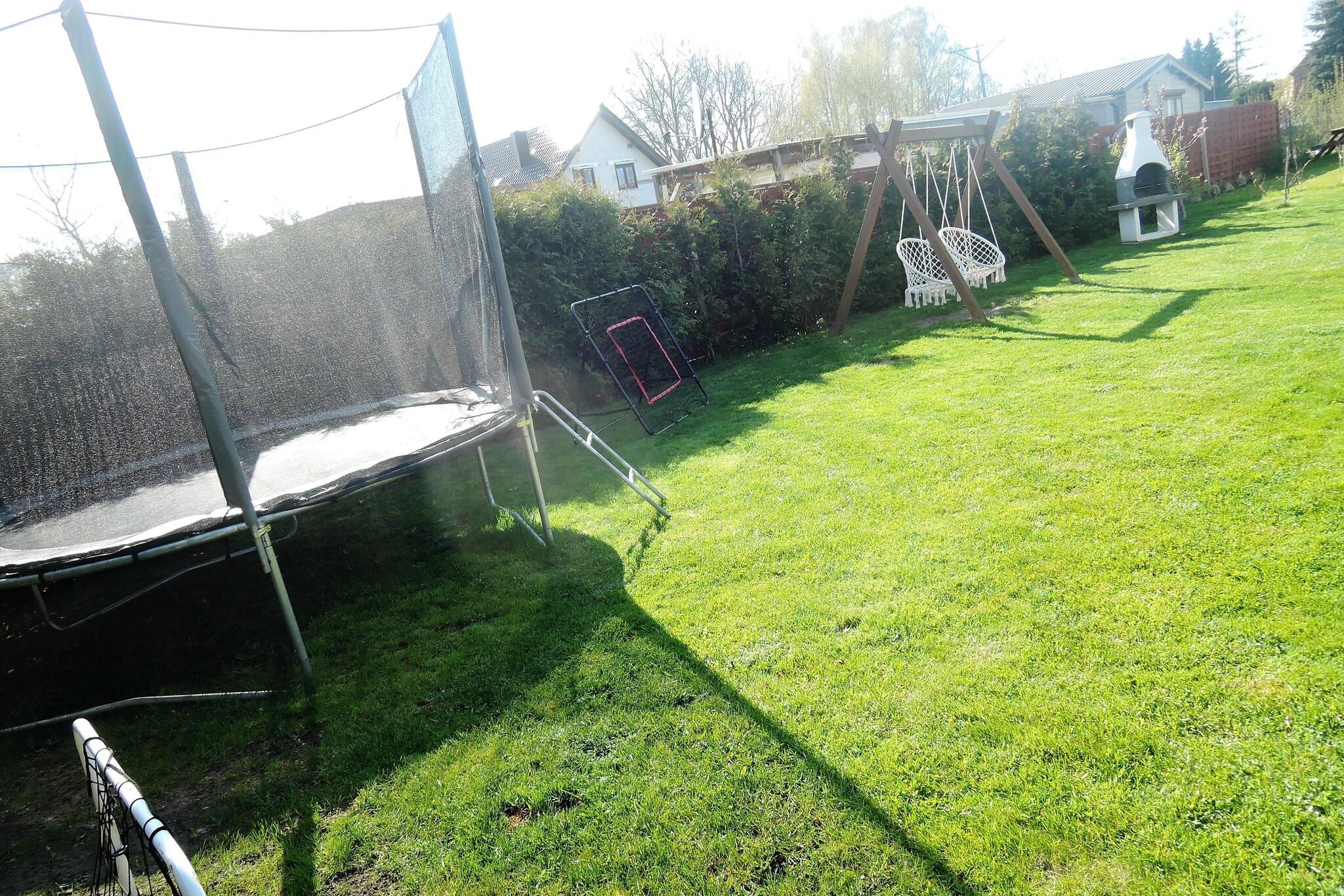 Parterre: (offene Küche(Esstisch, Wasserkocher, Kochendwasserhahn, Toaster, Kochherd(4 Kochplatten, elektrisch), Dunstabzugshaube, Espressomaschine, Kühl-/Gefrierkombination), Wohn-/Schlafzimmer(Doppelschlafcouch, TV), Schlafzimmer(Doppelbett), Schlafzimmer(Einzelbett, Einzelbett), Badezimmer(Dusche, Waschbecken, Toilette)) Terrasse, Garten(Gemeinschaftliche Nutzung mit anderen Gästen, umzäunt, angelegt), Gartenmöbel, Grill, Trampolin, Schaukel