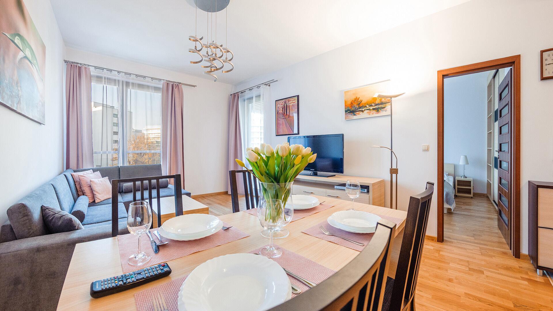 • Haustiere sind in der ausgewählten Wohnung erlaubt. Die Kosten für den Aufenthalt mit einem Haustier betragen 40 PLN pro Tag.