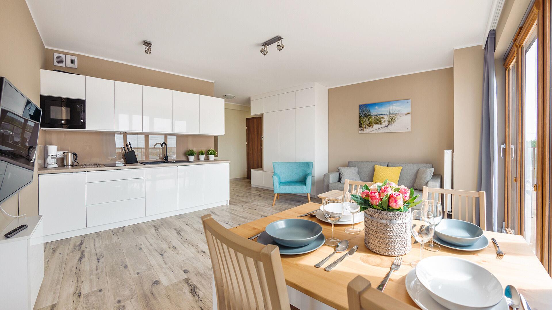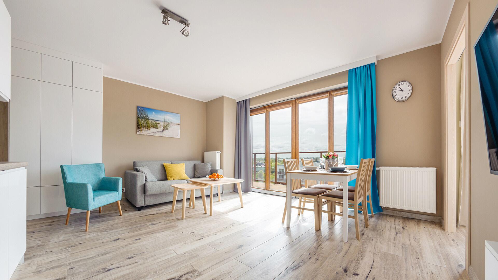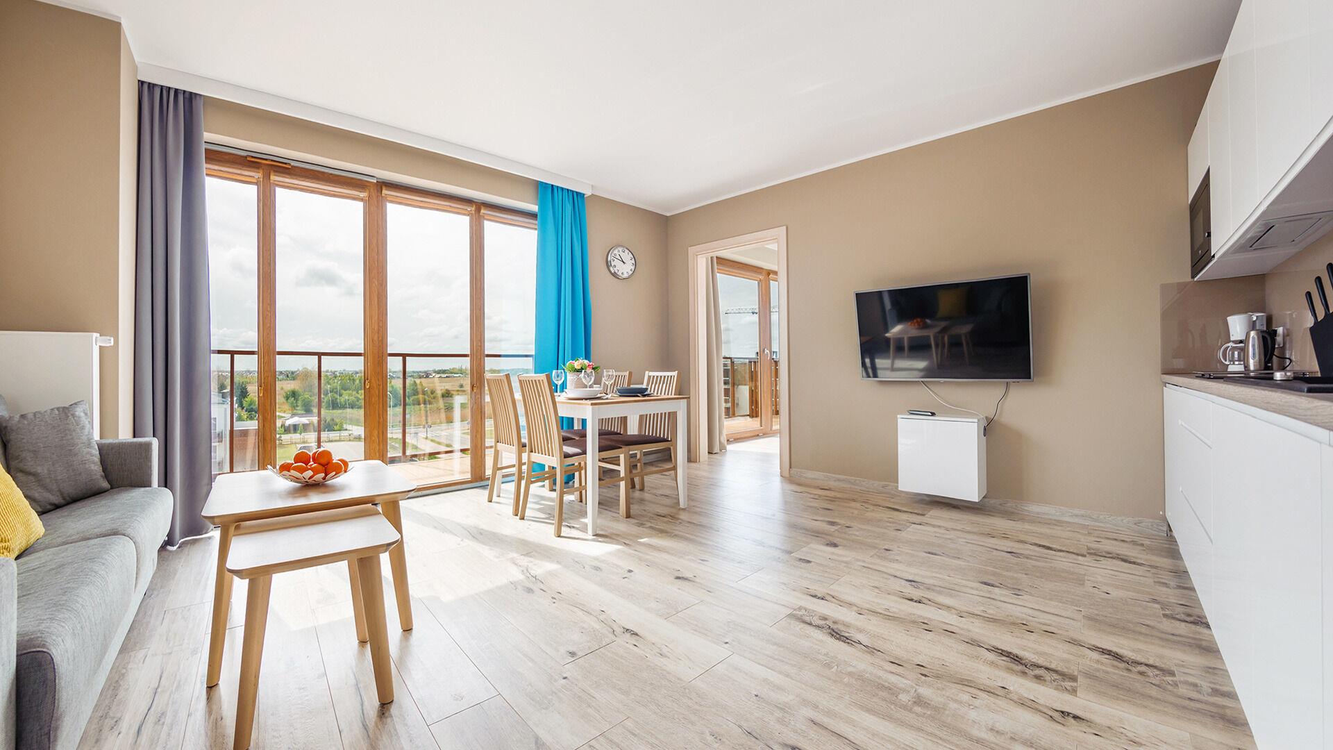 Die Apartments im Resorts Kolobrzeg liegen im ruhigen, westlichen Teil der Stadt, umgeben vom NATURA-2000-Park und nur wenige Minuten vom breiten Weststrand sowie einem Hundestrand entfernt. Die Lage bietet saubere Luft, direkten Kontakt zur Natur und Zugang zu Rad- und Spazierwegen. Die Apartments sind hochwertig ausgestattet und verfügen über voll ausgestattete Küchenzeilen sowie große Terrassen. Auf dem Gelände stehen nummerierte Außenparkplätze und Tiefgaragenplätze gegen Aufpreis zur Verfügung, zudem gibt es einen öffentlichen, kostenpflichtigen Parkplatz vor dem Gebäude. Gästen stehen ein täglich geöffneter Pool sowie eine Sauna zur Verfügung. Kolobrzeg bietet das ganze Jahr über zahlreiche Freizeit- und Kulturangebote sowie eine vielfältige Gastronomie.