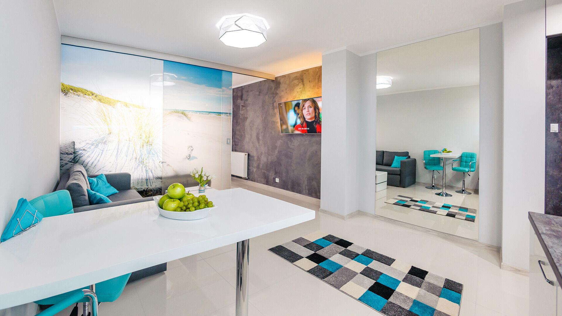 • Haustiere sind in der ausgewählten Wohnung erlaubt. Die Kosten für den Aufenthalt mit einem Haustier betragen 40 PLN pro Tag.