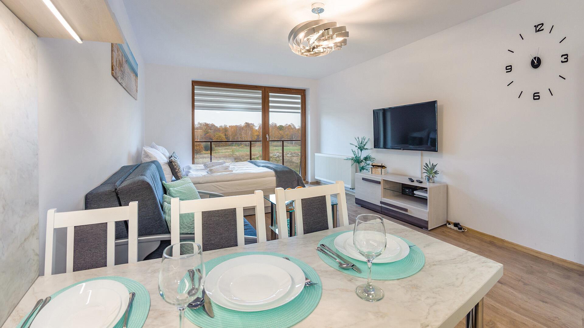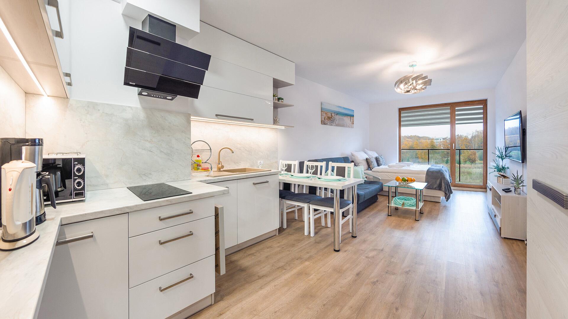 Die Apartments im Resorts Kolobrzeg liegen im ruhigen, westlichen Teil der Stadt, umgeben vom NATURA-2000-Park und nur wenige Minuten vom breiten Weststrand sowie einem Hundestrand entfernt. Die Lage bietet saubere Luft, direkten Kontakt zur Natur und Zugang zu Rad- und Spazierwegen. Die Apartments sind hochwertig ausgestattet und verfügen über voll ausgestattete Küchenzeilen sowie große Terrassen. Auf dem Gelände stehen nummerierte Außenparkplätze und Tiefgaragenplätze gegen Aufpreis zur Verfügung, zudem gibt es einen öffentlichen, kostenpflichtigen Parkplatz vor dem Gebäude. Gästen stehen ein täglich geöffneter Pool sowie eine Sauna zur Verfügung. Kolobrzeg bietet das ganze Jahr über zahlreiche Freizeit- und Kulturangebote sowie eine vielfältige Gastronomie.