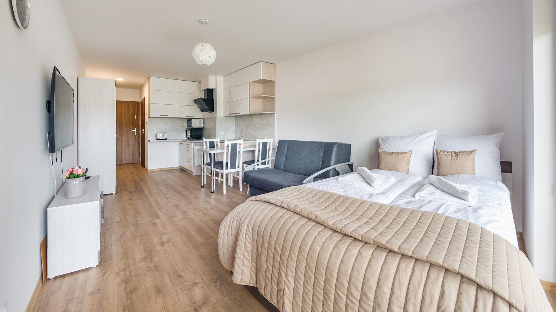 Die Apartments im Resorts Kolobrzeg liegen im ruhigen, westlichen Teil der Stadt, umgeben vom NATURA-2000-Park und nur wenige Minuten vom breiten Weststrand sowie einem Hundestrand entfernt. Die Lage bietet saubere Luft, direkten Kontakt zur Natur und Zugang zu Rad- und Spazierwegen. Die Apartments sind hochwertig ausgestattet und verfügen über voll ausgestattete Küchenzeilen sowie große Terrassen. Auf dem Gelände stehen nummerierte Außenparkplätze und Tiefgaragenplätze gegen Aufpreis zur Verfügung, zudem gibt es einen öffentlichen, kostenpflichtigen Parkplatz vor dem Gebäude. Gästen stehen ein täglich geöffneter Pool sowie eine Sauna zur Verfügung. Kolobrzeg bietet das ganze Jahr über zahlreiche Freizeit- und Kulturangebote sowie eine vielfältige Gastronomie.