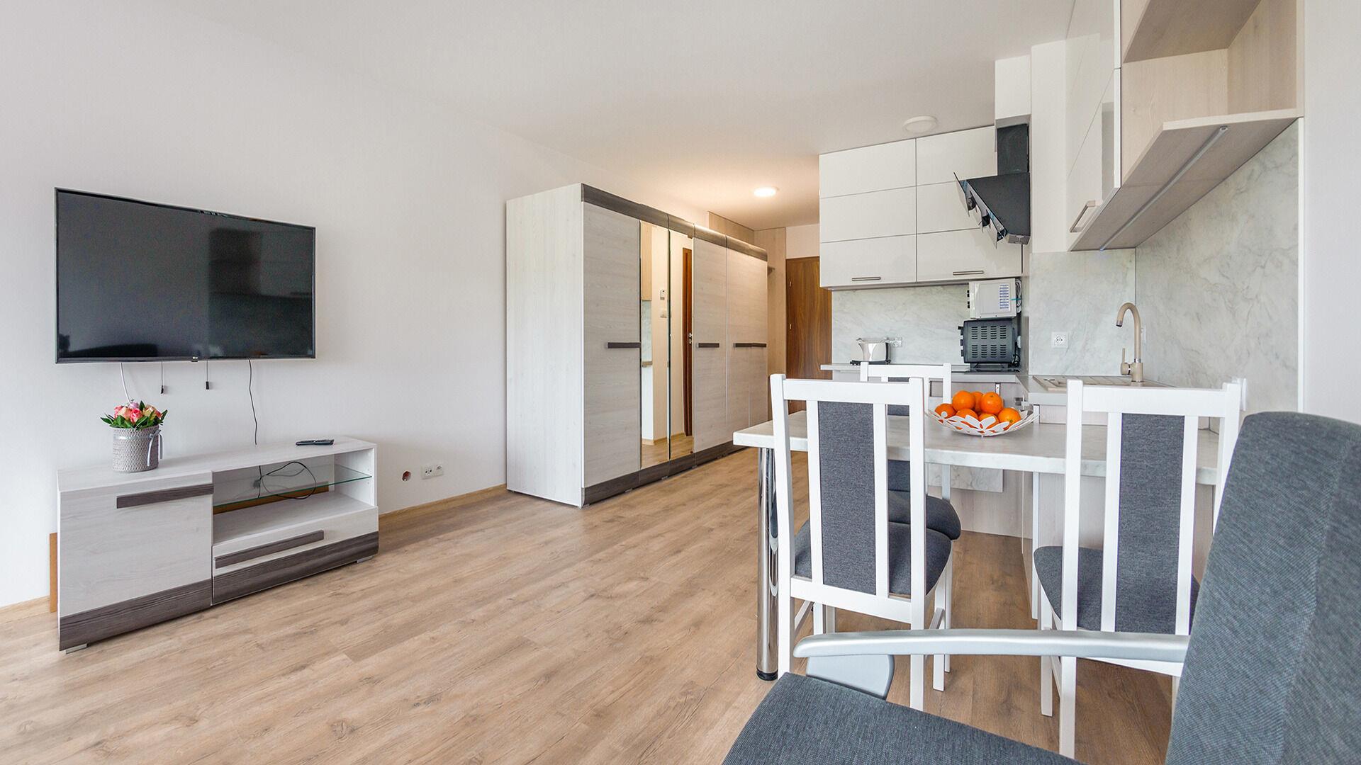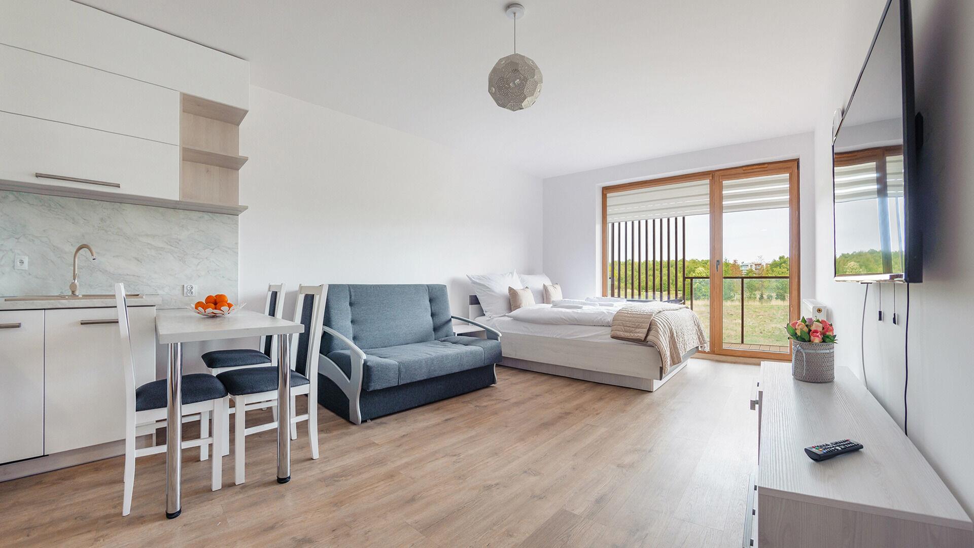 Die Apartments im Objekt Resorts Kolobrzeg befinden sich im westlichen Teil von Kolobrzeg, abseits des städtischen Trubels, umgeben vom Grün des NATURA-2000-Parks. Diese Lage garantiert saubere Luft, malerische Ausblicke und direkten Kontakt zur Natur. Die Plazowa-Straße mit ihren breiten Gehwegen und Radwegen ist ein Teil der R10-Fahrradroute. Ein fünfminütiger Spaziergang über einen direkten Zugang zum Meer reicht aus, um den breiten, sandigen „Weststrand” zu erreichen; ganz in der Nähe befindet sich auch ein Hundestrand. Alle Apartments sind hochwertig ausgestattet und verfügen über funktionale, voll ausgestattete Küchenzeilen sowie geräumige Terrassen mit Blick auf den Innenhof oder das Grün des NATURA-2000-Parks. Vor dem Gebäude gibt es einen öffentlichen, kostenpflichtigen Stadtparkplatz (begrenzte Anzahl an Stellplätzen). Auf dem Gelände stehen ein nummerierter Außenparkplatz sowie Parkplätze in der Tiefgarage zur Verfügung, die den meisten Apartments zugeordnet sind und gegen Aufpreis genutzt werden können. Im Objekt befindet sich ein Schwimmbad, das täglich von 10:00 bis 21:00 Uhr geöffnet ist, sowie eine Sauna, die täglich von 16:00 bis 21:00 Uhr geöffnet ist. Der Pool befindet sich im Gebäude A; aus Gebäude B gibt es keinen direkten Zugang zu Gebäude A.