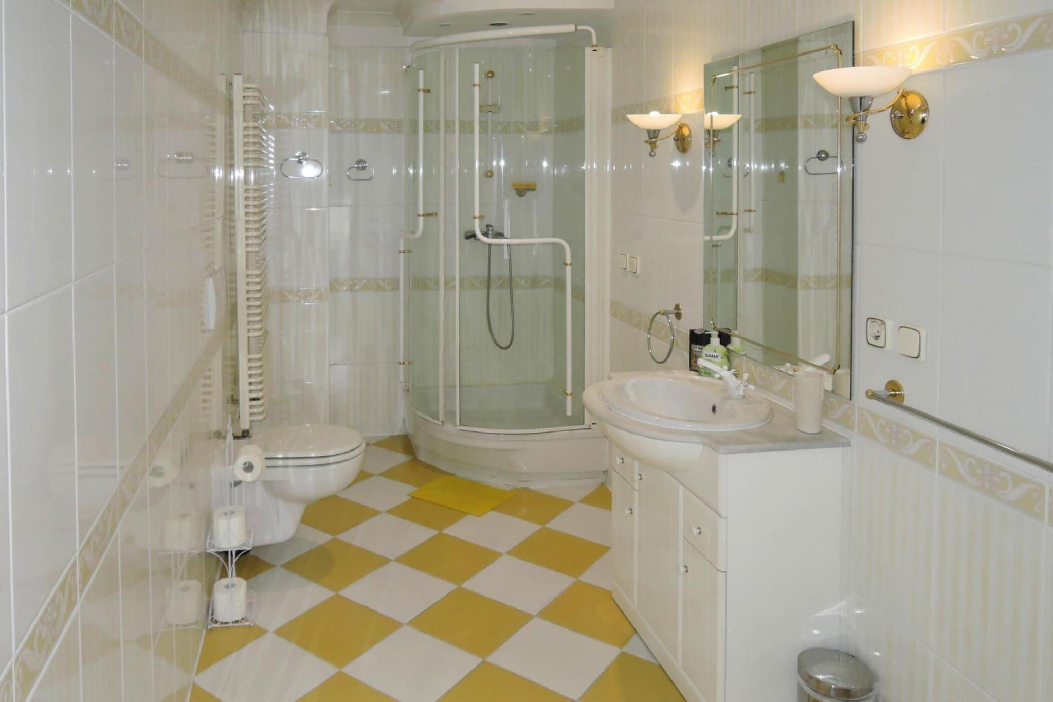 Große gemütliche, voll ausgestattete Ferienwohnung im beliebten Ferienort Misdroy mit direkter Lage am Wald des Wolliner Nationalparks in ruhiger Lage. Von dem 600 qm großen Grundstück stehen Ihnen 200 qm zur alleinigen Nutzung zur Verfügung. Genießen Sie den Ausblick an sonnigen Tagen von Ihrem Balkon aus und beobachten Sie das rege Treiben in der Stadt! In nur wenigen Minuten haben Sie von Ihrer Unterkunft die zahlreichen Einkaufsmöglichkeiten, Cafés und Restaurants in der Stadt erreicht. Umgeben von grünen Wäldern, in der Nähe des malerischen Kliffufers an der Ostsee und nicht weit hinter der deutsch-polnischen Grenze liegt der beliebte Badeort Miedzyzdroje (Misdroy) auf der Insel Wolin. Der lebhafte Kurort hat lange Tradition - Sie stoßen auf auf gesundheitsfürderndes Mikroklima, reine Gewässser der Pommerschen Bucht und eine gut ausgebaute touristische Infrastruktur. Die Highlights sind sicher der schöne Strand und der Woliner Nationalpark. Entlang der Promenade finden sich viele Cafés und Restaurants, in denen Sie verweilen und sich ein wenig kulinarisch verwöhnen lassen können. Im Zentrum des Ortes finden Sie eine große Einkaufspassage mit kleinen Läden und auch Supermärkte oder Discounter sind vorhanden. Aktivitäten in der Nähe : In Mi?dzyzdroje gibt es ein umfangreiches Angebot an Freizeitmöglichkeiten - Die Küste ist weitestgehend unverbaut, im schönen Hinterland können Sie nach Herzenslaune aktiv sein, mit vielen Rad- und Wanderwegen ein Traum für Naturliebhaber. Im Sommer finden auf der Freilichtbühne im Kurpark regelmäßig Kurkonzerte sowie mehrere Musikfestivals statt. Von der Seebrücke aus gibt es einen regen Ausflugsverkehr zur benachbarten Insel Usedom. Die Insel im Westen des Landes bietet landschaftliche Höhepunkte soweit das Auge reicht: unverfälschte Natur, tiefblauen Seen und weiße breite Strände werden Sie begeistern. Mit etwas Glück können Sie im Nationalpark Seeadler, Rotwild und Wildschweine beobachten. Wie wäre es außerdem mit einem Stadtbummel durch Swinemünde? Am besten fahren Sie mit dem Linienbus oder der Eisenbahn in die Grenzstadt.