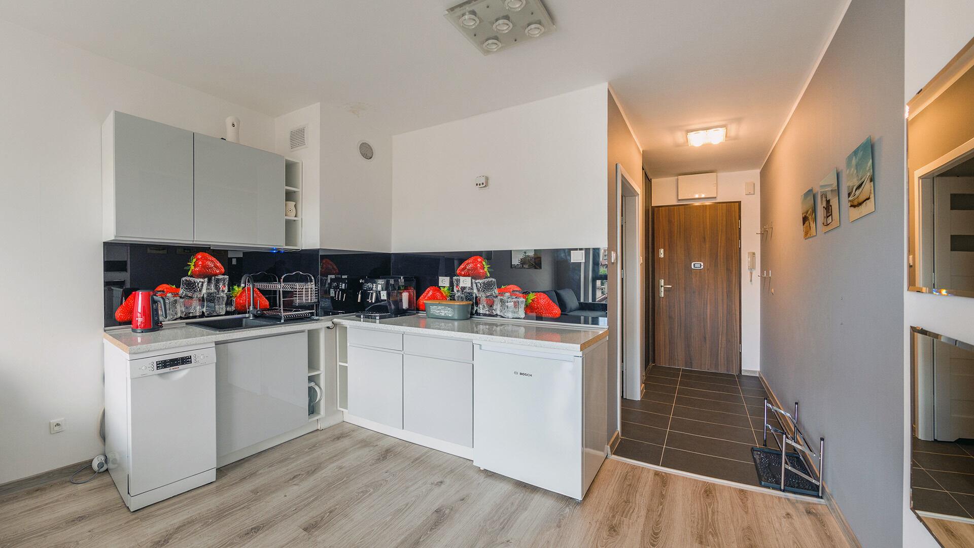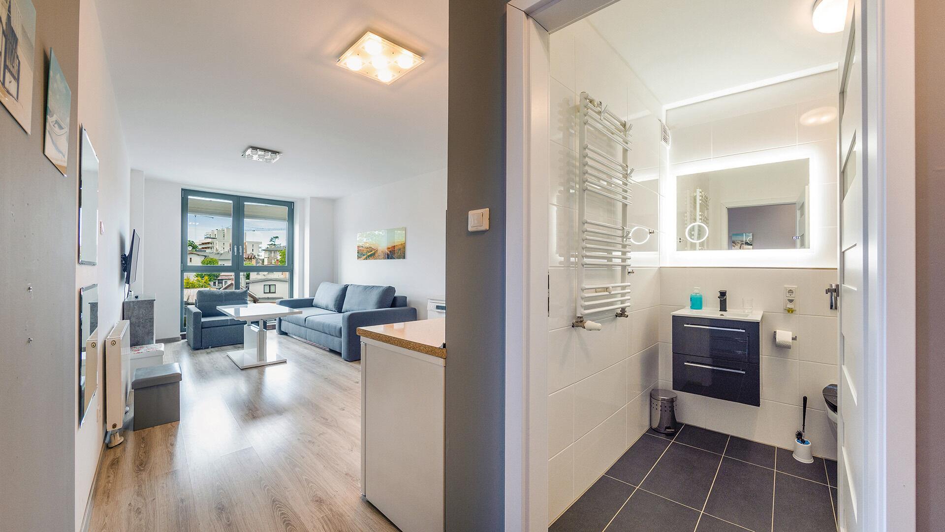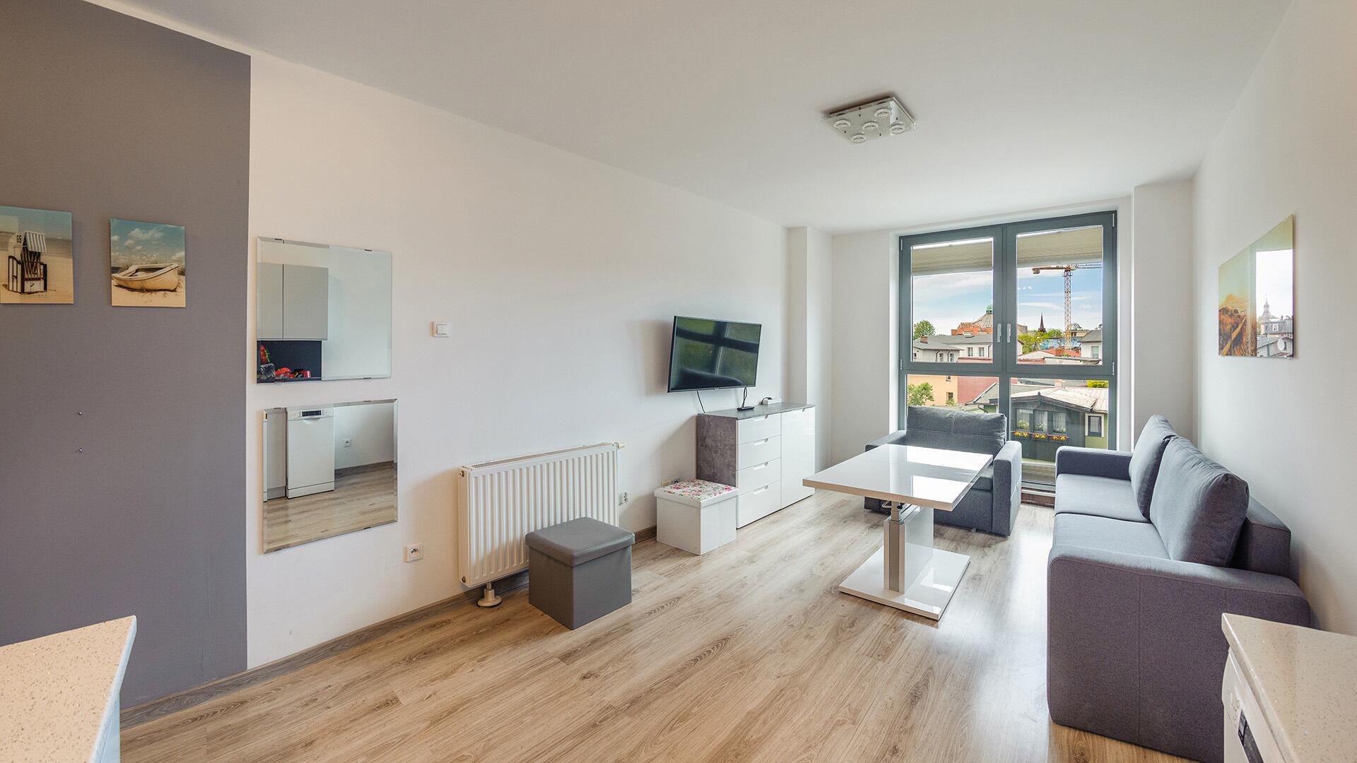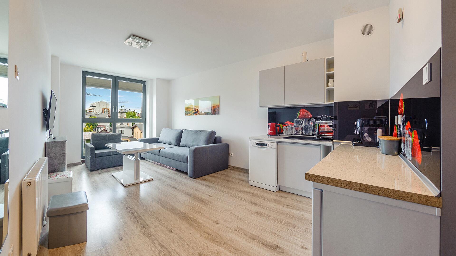 • Haustiere sind in der ausgewählten Wohnung erlaubt. Die Kosten für den Aufenthalt mit einem Haustier betragen 40 PLN pro Tag.
