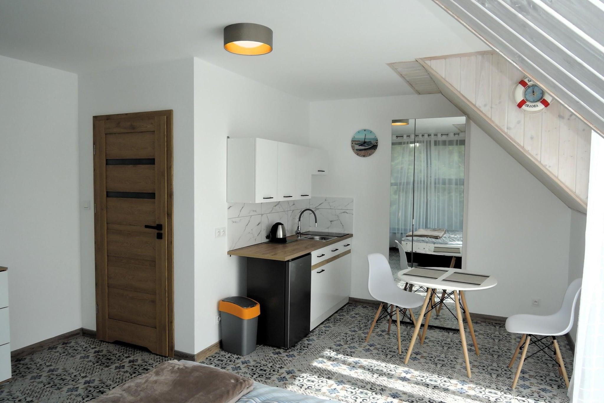 Die komfortable Ferienwohnung in Mrzezyno genießt eine einzigartige Lage direkt neben Sandstränden, umgeben von üppigen Wäldern, was sie zu einem idealen Ort für Entspannung, Erholung und Regeneration macht. Dank seiner Lage im Herzen des Resorts ist es ein hervorragender Ausgangspunkt, um die Stadt mit ihren Sommerattraktionen und malerischen Waldwegen und -straßen zu entdecken, die zu Spaziergängen und Radtouren inmitten der Natur einladen. Das Apartment bietet komfortable Bedingungen für Ihren Aufenthalt und verfügt über ein geräumiges Wohnzimmer mit bequemen Betten, verbunden mit einer ausgestatteten Küche, einschließlich Kühlschrank und Kaffeemaschine, sowie einem Badezimmer mit Dusche. Ein zusätzlicher Vorteil ist eine große Terrasse (im ersten Stock, gemeinsam mit anderen Gästen genutzt) mit einer Fläche von 40 m2, von der sich eine malerische Aussicht bietet, ideal für ein morgendliches Frühstück an der frischen Luft oder zum Entspannen am Abend. Bettwäsche ist im Apartment vorhanden. Darüber hinaus steht den Gästen ein Parkplatz sowie Breitband-Internet zur Verfügung.