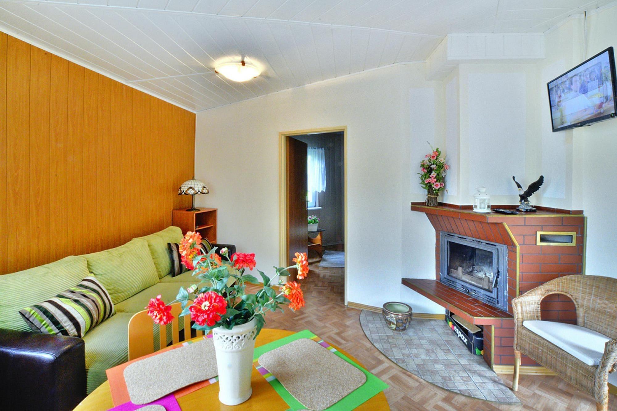 Parterre: (offene Küche(Kochplatte(2 Kochplatten, elektrisch), Wasserkocher, Toaster, Dunstabzugshaube, Kaffeemaschine, Mikrowelle, Kühl-/Gefrierkombination), Wohn/Esszimmer(Doppelschlafcouch, TV(Flatscreen, Satellit, Deutsch Fernsehsender), Esstisch(4 Personen), Kaminofen), Schlafzimmer(Doppelbett), Schlafzimmer(Doppelschlafcouch), Badezimmer(Dusche, Waschbecken, Föhn), Toilette(Waschbecken, Toilette)) Anlegesteg, Liegewiese, Heizung(Holz), Terrasse, Garten(Gemeinschaftliche Nutzung mit anderen Gästen, umzäunt, 10000 m2), Garten(alleinige Nutzung, 1000 m2), Gartenmöbel, Liegen, Grill(Holzkohle), Parkplatz, Teich, Sonnenschirm, Hochstuhl, Außenkamin, Babybett (kostenlos)