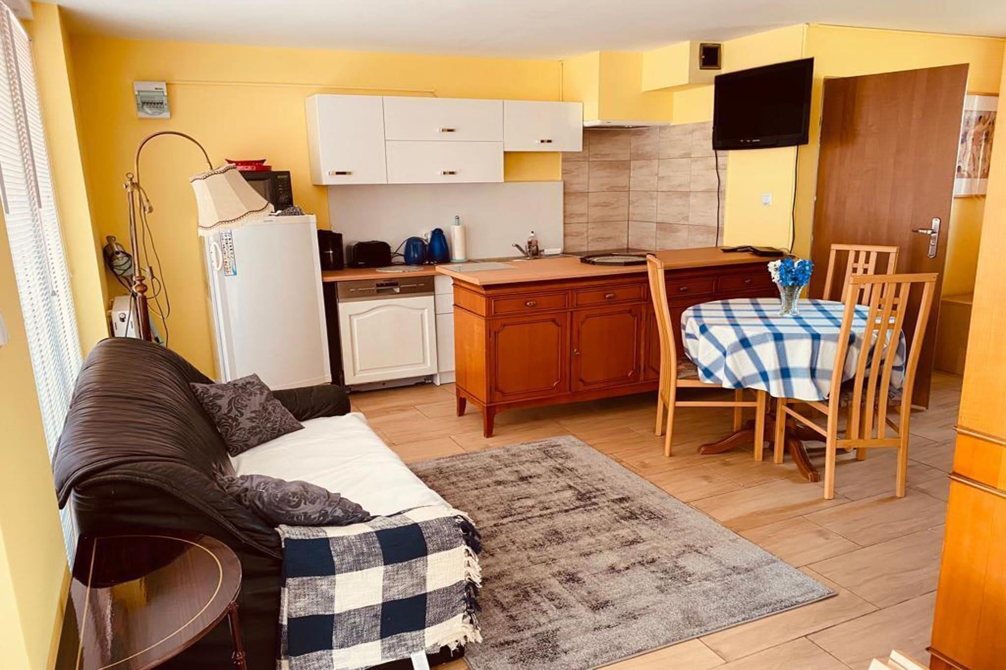 Parterre: (Kochnische(Wasserkocher, Kochendwasserhahn, Toaster, Kochherd(2 Kochplatten, elektrisch), Espressomaschine, Mikrowelle, Spülmaschine, Kühl-/Gefrierkombination), Wohn-/Schlafzimmer(Doppelschlafcouch, TV(Satellit, Deutsch Fernsehsender), Esstisch), Schlafzimmer(Einzelbett, Einzelbett), Badezimmer(Dusche, Waschbecken, Toilette)) Terrasse(alleinige Nutzung, umzäunt, 60 m2), Garten, Gartenmöbel, Grill, Parkplatz