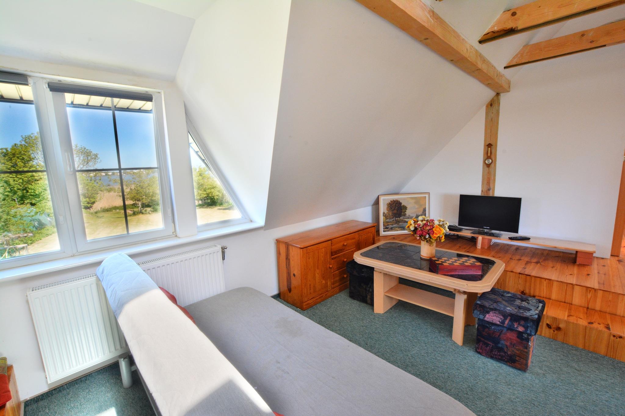 Parterre: (Esszimmer(Esstisch), offene Küche(Wasserkocher, Toaster, Kochherd(2 Kochplatten, Gas), Kaffeemaschine, Mikrowelle, Spülmaschine, Kühl-/Gefrierkombination, Waschmaschine), Badezimmer(Dusche, Waschbecken, Toilette, Föhn)) In der 1. Etage: (Wohnzimmer(Doppelschlafcouch, TV(Flatscreen, Deutsch Fernsehsender)), Schlafzimmer(Einzelbett, Einzelbett), Schlafzimmer(Einzelbett, Doppelklappbett (140 x 180 cm))) In der 2. Etage: (Galerieschlafzimmer(über steile Treppe)(Doppelklappbett (140 x 180 cm))) Anlegesteg, Internet, Angeln, Bootvermietung, Liegewiese, Heizung(Zentral), Terrasse, Garten(alleinige Nutzung, umzäunt, 20 m2), Garten(Gemeinschaftliche Nutzung mit dem Eigentümer, 2000 m2), Gartenmöbel, Liegen, Grill(Holzkohle), Parkplatz, Bügelbrett, Bügeleisen, Gesellschaftsspiele, Sonnenschirm