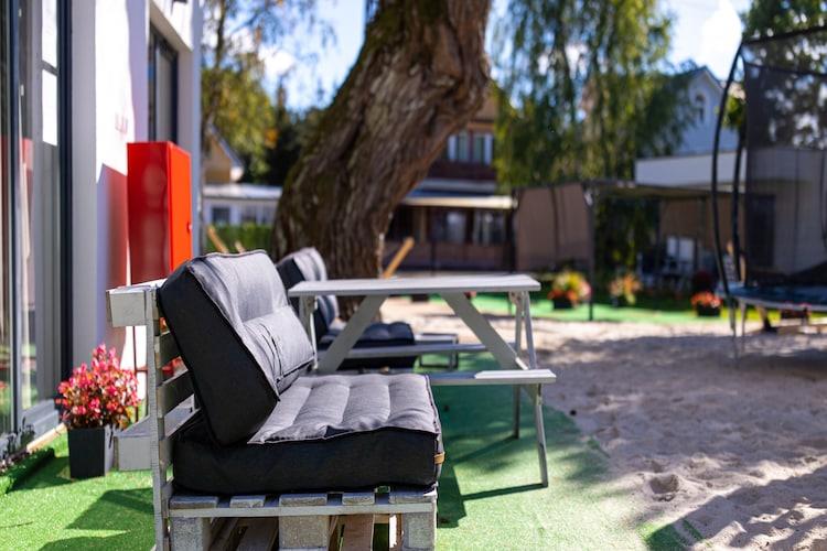 Parterre: (offene Küche(Wasserkocher, Kochendwasserhahn, Kochherd(2 Kochplatten, elektrisch), Kühl-/Gefrierkombination), Wohn-/Schlafzimmer(Doppelschlafcouch, TV, Esstisch), Schlafnische(Einzelbett, Einzelbett), Badezimmer(Dusche, Waschbecken, Toilette)) In der 1. Etage: (Schlafzimmer(Doppelbett, Doppelbett)) Terrasse, Garten, Gartenmöbel, Liegen, Grill, Trampolin, Sandkasten, Spielgeräte, Rutsche, Hängematte, Hochstuhl
