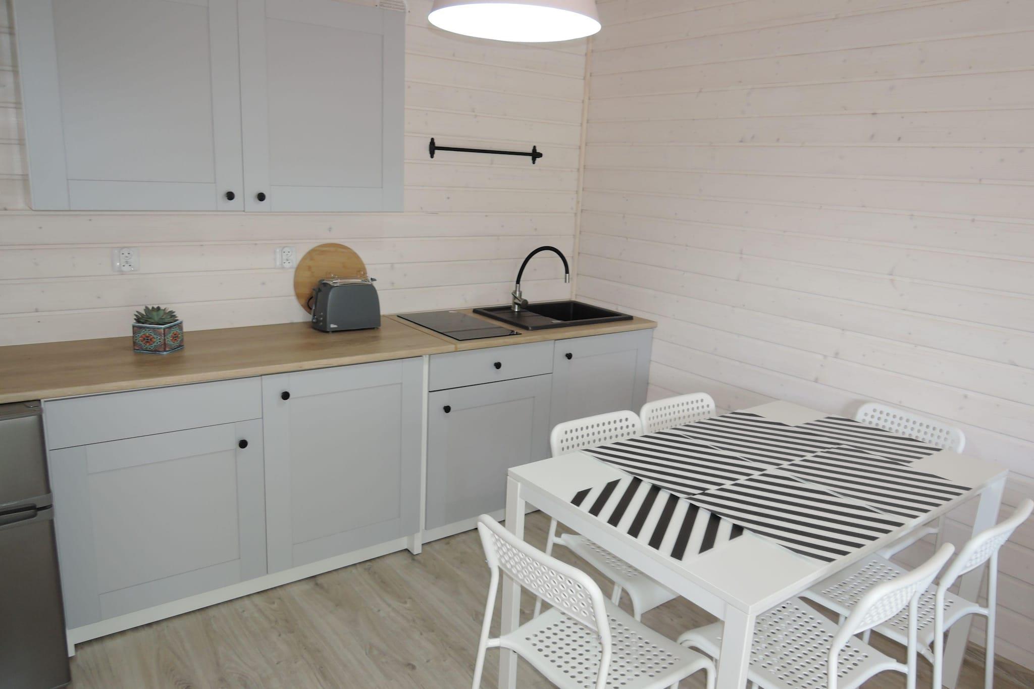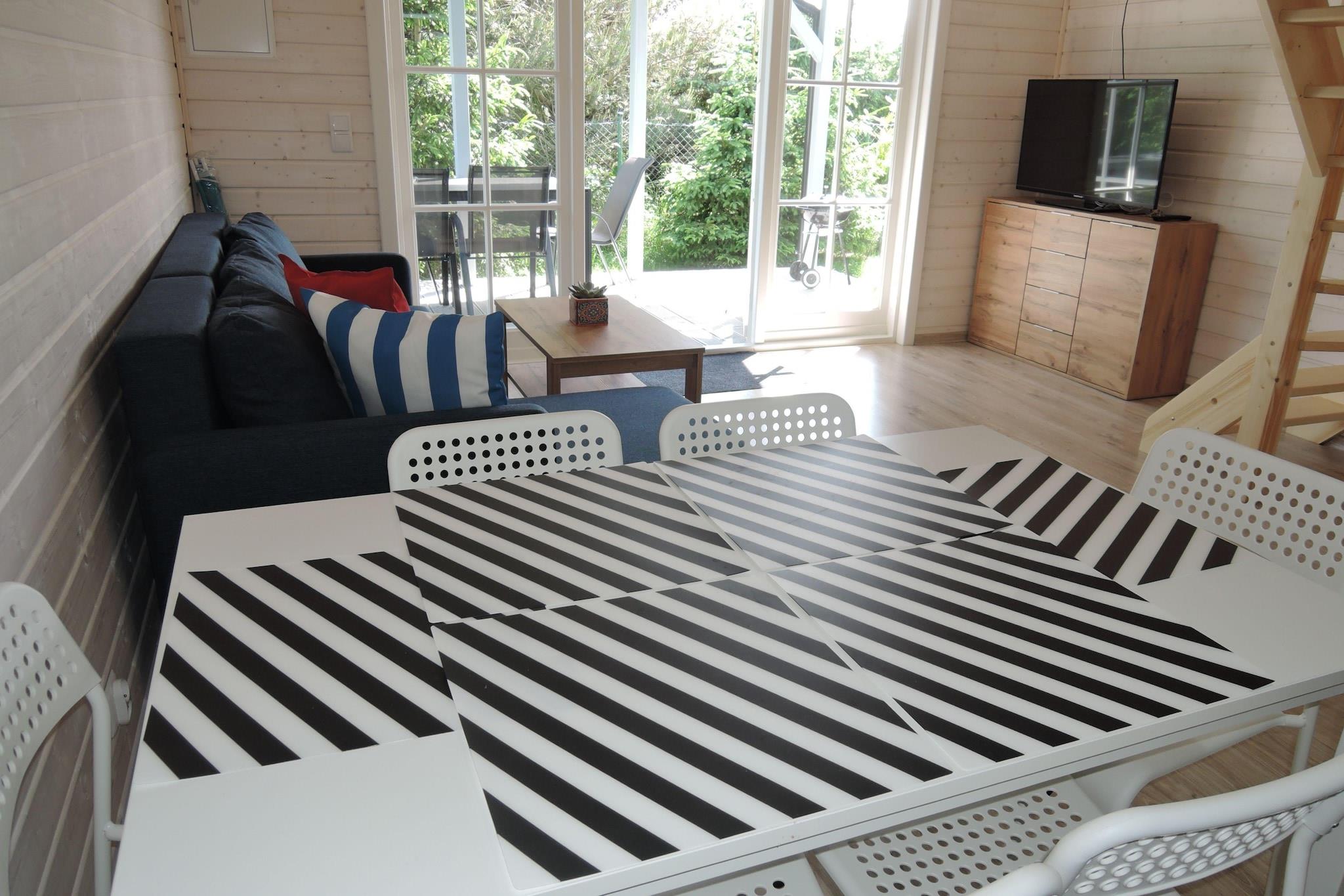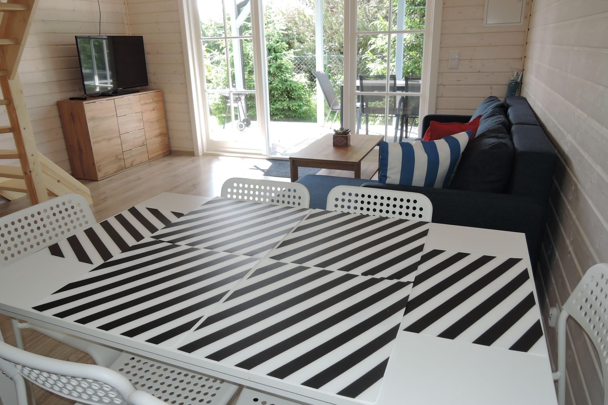 Parterre: (offene Küche(Esstisch, Wasserkocher, Kochendwasserhahn, Kochherd(2 Kochplatten, elektrisch), Espressomaschine, Kühl-/Gefrierkombination), Wohn-/Schlafzimmer(Doppelschlafcouch, TV(Satellit), Sitzecke), Badezimmer(Dusche, Waschbecken, Toilette)) In der 1. Etage: (Schlafzimmer(Doppelbett), Schlafzimmer(2x Einzelbett)) Grill, Heizung, Garten(Gemeinschaftliche Nutzung mit anderen Gästen, umzäunt, angelegt), Gartenmöbel, Parkplatz, Trampolin, Rutsche, Schaukel, Babybett (kostenlos)