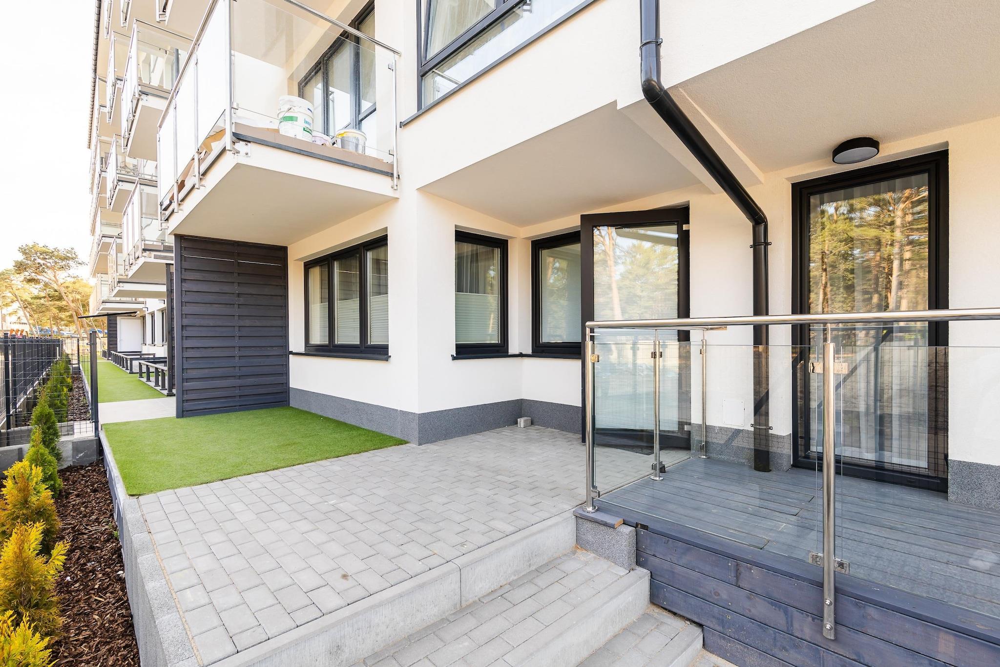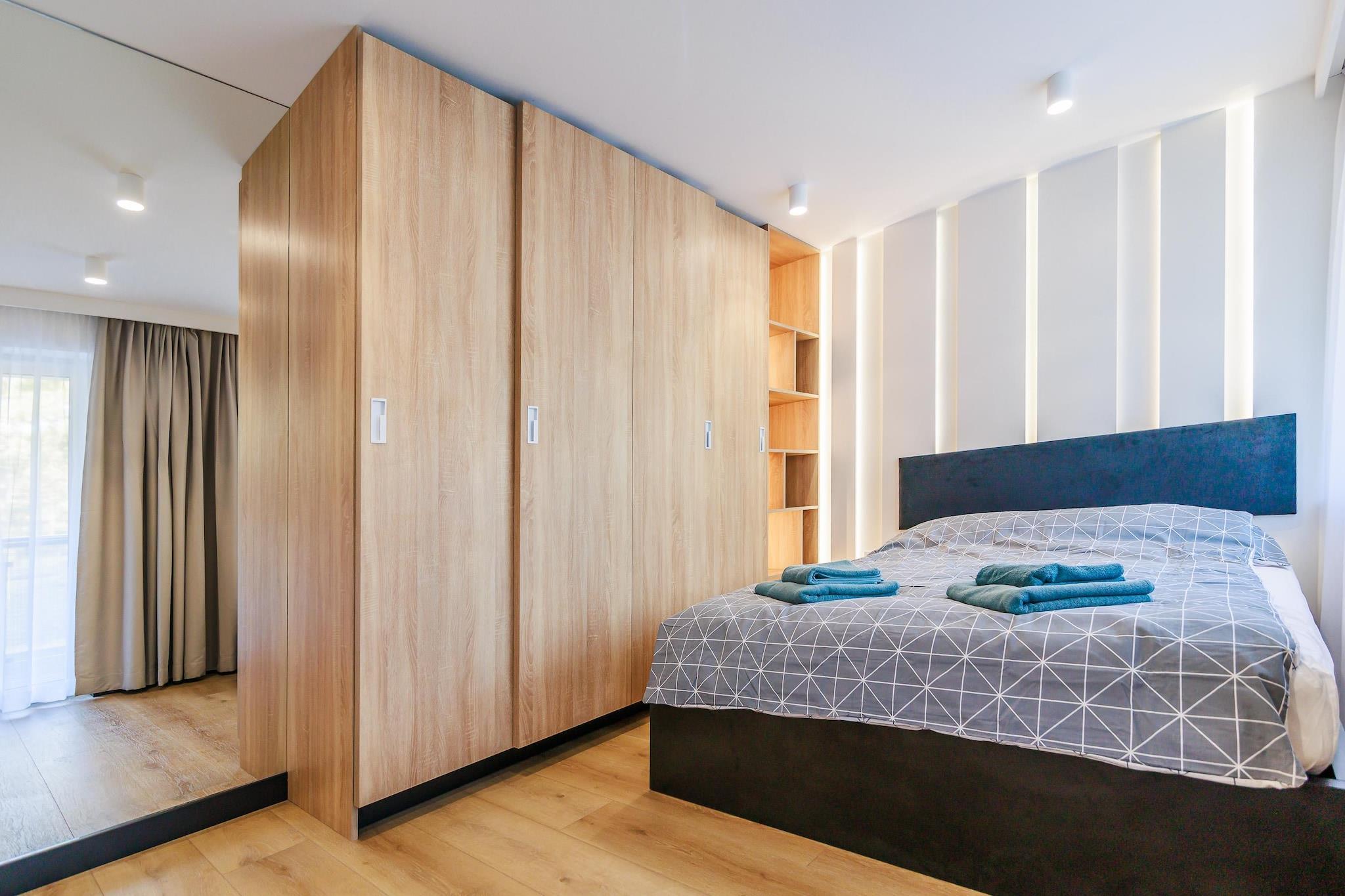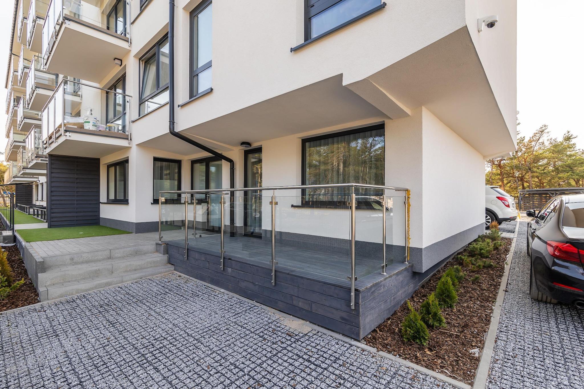 Ein moderner Apartmentkomplex in einem Küstenwald, praktisch direkt am Strand von Rowy. Das Meer ist nur 100 Meter entfernt, das Ortszentrum ca. 600 Meter. Dieses luxuriöse und geräumige Apartment befindet sich im Hochparterre. Es ist modern und mit hochwertigen Materialien eingerichtet und verfügt über ein Wohnzimmer (mit TV, bequemer Doppelschlafcouch und Couchtisch), eine voll ausgestattete Küche, zwei separate Schlafzimmer (eines mit Doppelbett, das andere mit zwei Einzelbetten) sowie ein Badezimmer mit Dusche (inkl. Waschmaschine). Das Apartment bietet eine Terrasse und einen Balkon. Zentralheizung ist vorhanden. WLAN steht zur Verfügung. Ein bewachter Parkplatz befindet sich direkt neben dem Apartment. Ein Kinderspielplatz ist im Ferienkomplex vorhanden. Im Preis inbegriffen sind Bettwäsche, Handtücher, Strom, Wasser, Heizung, Endreinigung, Internet, Parkplatz und Kurtaxe. Der Ferienort Rowy liegt zwischen der Ostsee und dem Gardner See. Der Ort bietet eine große Auswahl an gut bewerteten Bars und Restaurants. Nur wenige Gehminuten von der Wohnung entfernt, durch das Stadtzentrum und über den Lupawa-Kanal, der das offene Meer mit dem See verbindet, liegt der Eingang zum Nationalpark Slowinski (dem drittgrößten Polens). Zahlreiche reizvolle Wanderwege laden dazu ein, die Hauptattraktionen zu entdecken: den Leuchtturm Czolpino, einen überfluteten Wald, Wanderdünen, Heidelandschaften, eine Leuchtturmwärtersiedlung und Aussichtspunkte über den Gardno-See. Ein Spaziergang durch die bis zu 40 Meter hohen Dünen ist ein unvergessliches Erlebnis. Der Park erstreckt sich über rund 35 Kilometer entlang der Küste zwischen Rowy und dem attraktiven Badeort Leba. Der Strand in Rowy ist außergewöhnlich breit. Der Fischereihafen und die neoromanische Kirche des Ortes sind ebenfalls einen Besuch wert. Angler zieht es zudem an den Fluss Lupawa.