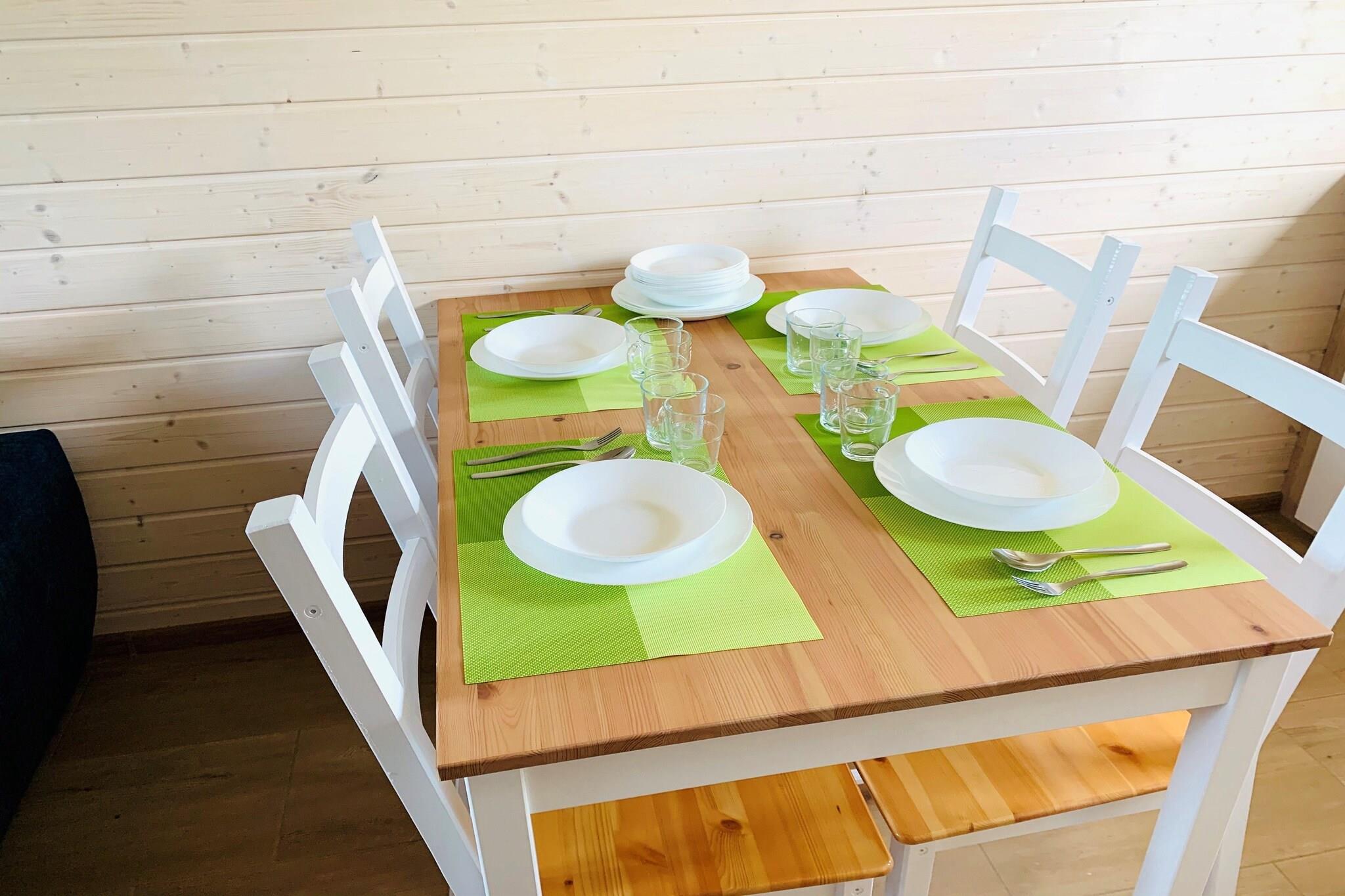 Parterre: (offene Küche(Wasserkocher, Toaster, Kochherd(1 Kochplatte, Induktion), Kaffeemaschine, Mikrowelle, Kühl-/Gefrierkombination), Wohn/Esszimmer(Doppelschlafcouch, TV(Flatscreen), Esstisch), Badezimmer(Dusche, Waschbecken, Toilette)) In der 1. Etage: (Schlafzimmer(Einzelbett, Doppelbett), Schlafzimmer(Einzelbett, Doppelbett)) Rezeption, Internet, Spielplatz, Liegewiese, Babybadewanne, Waschmaschine(Gemeinschaftliche Nutzung mit anderen Gästen, gegen Gebühr), Heizung(elektrisch), Terrasse(überdacht), Garten(Gemeinschaftliche Nutzung mit anderen Gästen, umzäunt, 1000 m2), Gartenmöbel, Liegen, Grill(Holzkohle), Trampolin(Gemeinschaftliche Nutzung mit anderen Gästen), Rutsche(Gemeinschaftliche Nutzung mit anderen Gästen), Hochstuhl, Schaukel, Babybett (kostenlos)