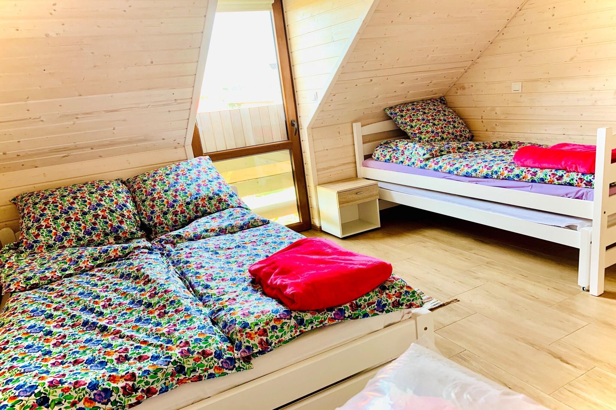 Auf einem umzäunten Grundstück, 350 m vom Meer und nur wenige Schritte vom Stadtzentrum entfernt, befindet sich ein Familienferienort, der Unterkunft in komfortablen Ferienhäusern bietet. Zweistöckige Häuser mit überdachten Terrassen, auf denen Gartenmöbel und Grillmöglichkeiten auf Sie warten. Im Erdgeschoss gibt es ein Wohnzimmer (Doppelschlafcouch, Fernseher, Tisch), das mit der Küche verbunden ist, und ein Badezimmer mit Dusche. Im ersten Stock gibt es zwei Dreibettzimmer. Elektroheizung. WLAN ist verfügbar. Das Zentrum verfügt über einen sicheren Parkplatz und einen attraktiven Spielplatz für Kinder. Eine Waschmaschine steht zur Verfügung (gegen Gebühr). Im Preis Ihres Aufenthalts inbegriffen: Bettwäsche, Endreinigung, Wasserverbrauch, Internet, Parkplatz. Babybett und Hochstuhl auf Anfrage erhältlich. Sarbinowo ist ein kleiner, malerisch gelegener Sommerurlaubsort an der Westküste, wenige Kilometer westlich von Mielno. Hier erwarten Sie saubere, breite Strände, die perfekt sind, um dem Trubel der Stadt zu entfliehen. Der internationale Radwanderweg R-10 rund um das Ostseebecken verläuft ganz in der Nähe des Zentrums. Wir empfehlen Ausflüge ins malerische Chlopy, ins Zentrum von Sarbinowo, zum Leuchtturm in Gaski und nach Ustronie Morskie. Für Familien mit Kindern ist der Pomerania Fun Park ein tolles Ziel für einen Tagesausflug. Auf einer Fläche von über 30 Hektar kann die ganze Familie gemeinsam Spaß haben. Darüber hinaus stehen den Gästen zwei Restaurants und zahlreiche gastronomische Angebote zur Verfügung.