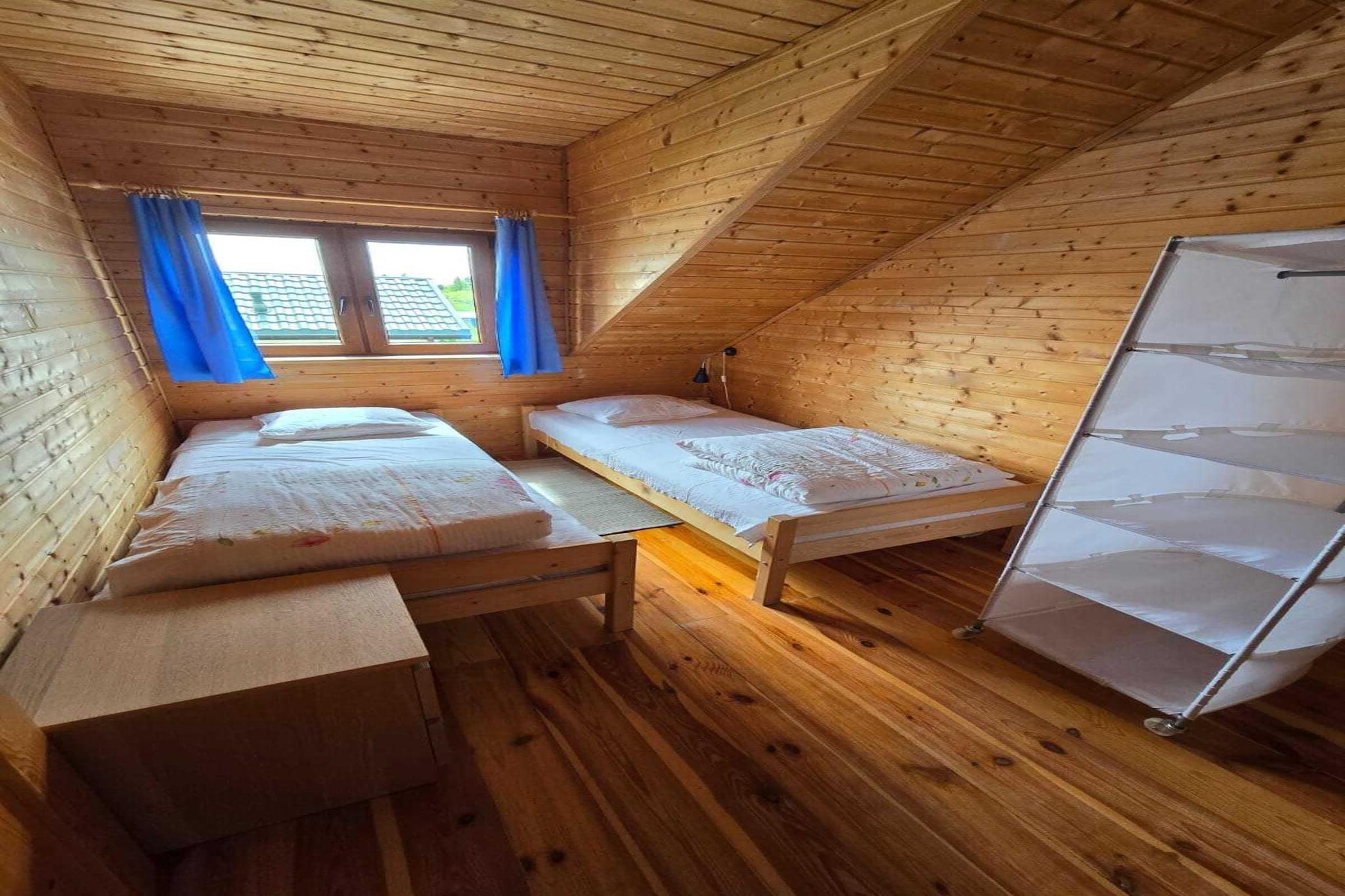 Parterre: (offene Küche(Kochplatte(1 Kochplatte, Induktion), Wasserkocher, Kaffeemaschine, Mikrowelle, Kühl-/Gefrierkombination), Wohn/Esszimmer(Doppelschlafcouch, TV(Flatscreen), Esstisch), Badezimmer(Dusche, Waschbecken, Toilette)) In der 1. Etage: (Schlafzimmer(Einzelbett, Einzelbett), Schlafzimmer(Einzelbett, Einzelbett, Einzelbett)) Internet, Parkplatz, Spielplatz, Liegewiese, Heizung(elektrisch), Terrasse(überdacht), Garten(Gemeinschaftliche Nutzung mit anderen Gästen, umzäunt), Gartenmöbel, Liegen, Grill(Holzkohle), Trampolin(Gemeinschaftliche Nutzung mit anderen Gästen), Sandkasten(Gemeinschaftliche Nutzung mit anderen Gästen), Hochstuhl, Schaukel, Babybett (kostenlos)