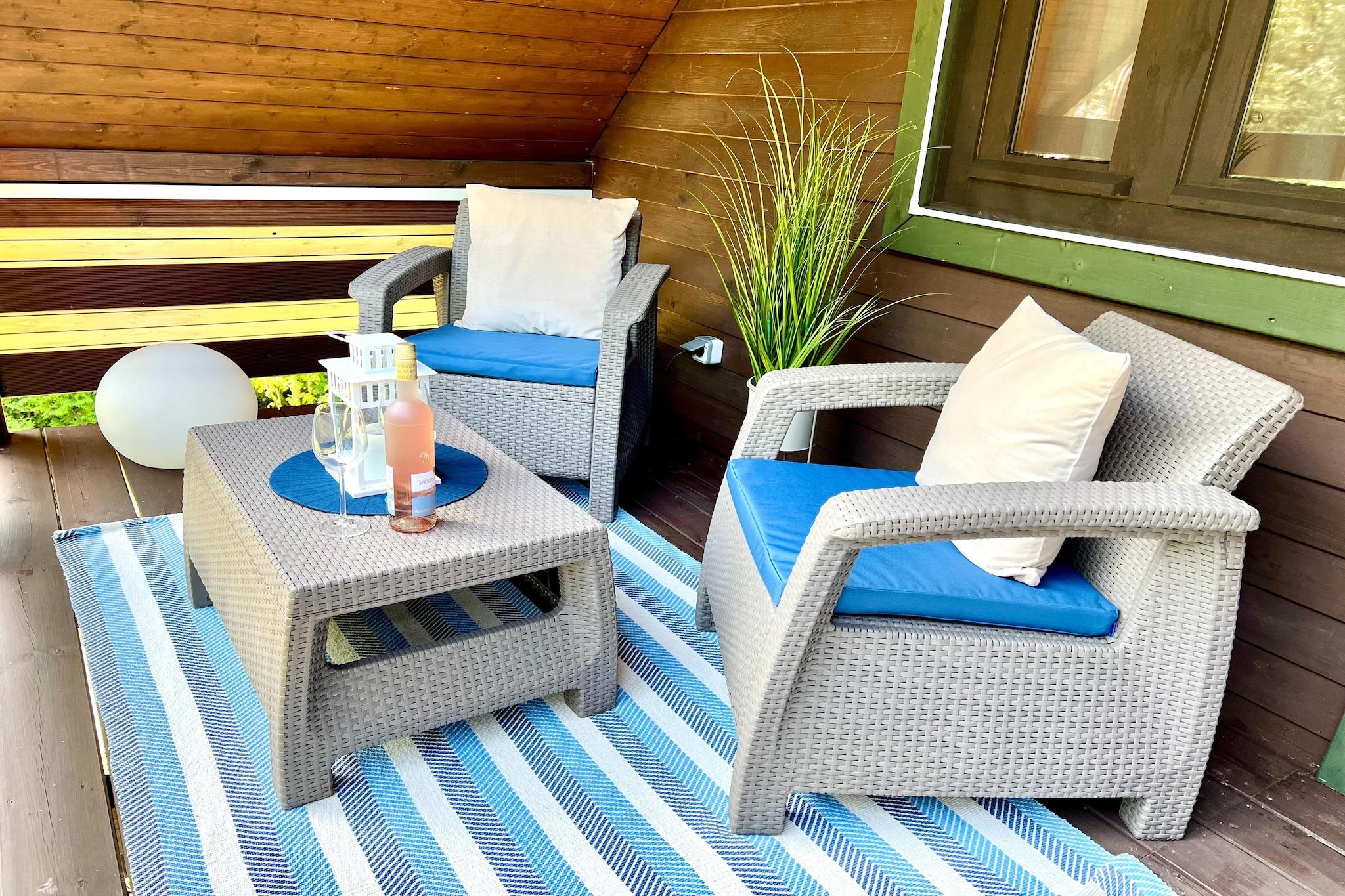 Parterre: (offene Küche(Herd, Wasserkocher, Toaster, Kaffeemaschine, Backofen, Kühl-/Gefrierkombination), Wohn/Esszimmer(Doppelschlafcouch, TV(Deutsch Fernsehsender), DVD-Spieler, Radio)) In der 1. Etage: (Schlafzimmer(2x Einzelbett), Schlafzimmer(Doppelbett)) Badezimmer(Dusche, Toilette, Föhn), Grill, Waschmaschine, Balkon, Heizung(elektrisch), Terrasse(überdacht), Gartenmöbel, Parkplatz, Hochstuhl, Außenkamin, Babybett (kostenlos)