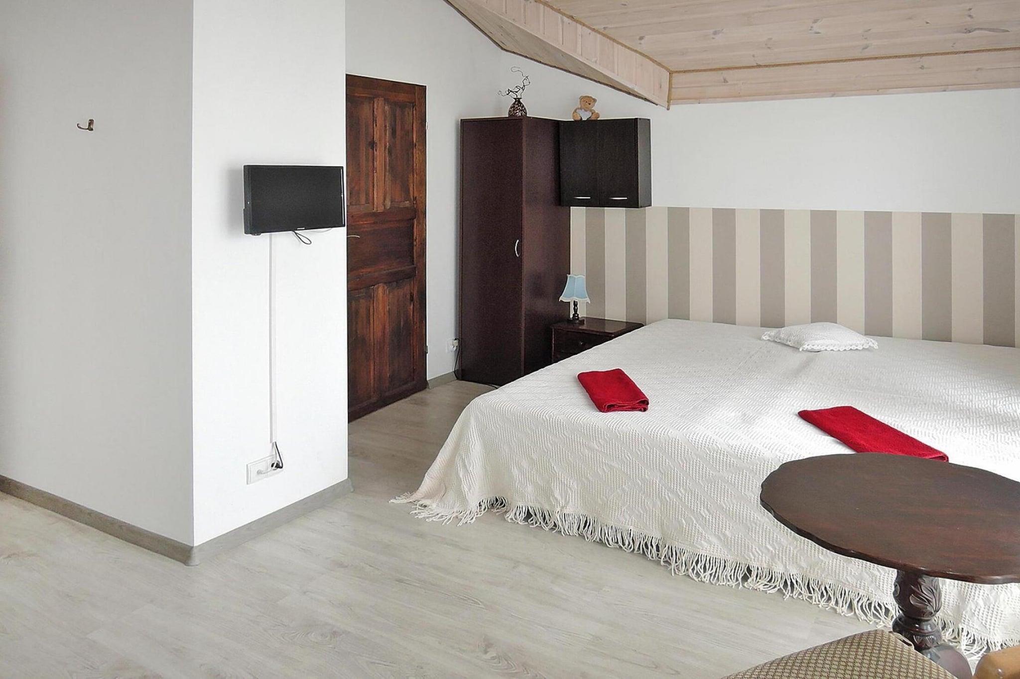 Direkter Zugang zum See mit Naturstrand: XXL-Doppelhaushälfte mit Platz für bis zu 16 Personen, nur 100 Meter bis zur Bademöglichkeit Naturstrand! Das große Haus mit seiner hellen und freundlichen Einrichtung bietet mit seinen 7 Schlafräumen für jeden genügend Platz und Rückzugsmöglichkeiten. Auf der schönen Terrasse können Sie bei gesundem Klima frühstücken, abends grillen oder einfach nur entspannen und die Ruhe genießen. Zwei Ruderboote und ein Kanu stehen Ihnen kostenfrei zur Verfügung - ideal für Entdeckertouren auf dem Wasser. Ihr Feriendomizil liegt am Rand des kleinen Dorfes Troszyn, nur 7 Kilometer von Wolin entfernt. Das Dorf ist ein Paradies für Naturliebhaber, Angler, Pilzesammler und Jäger. Wenn Sie möchten, können Sie landwirtschaftliche Produkte von dem Bauernhof vor Ort kaufen. HighLights : WLAN 1 Kanu 2 Ruderboote Aktivitäten in der Nähe : In der 7 kilometer entfernten Stadt Wolin sind schon einige interessante Sehenswürdigkeiten zu entdecken: der Markt mit dem Heimatmuseum, das Wikinger Freilichtmuseum, die Holländische Windmühle oder der Galgenberg mit seinen Hügelgräbern aus dem 11. Jahrhundert. Dann können Sie natürlich neben einem Besuch des Wisentgeheges im Nationalpark herrliche Radtouren oder Wanderungen an der beeindruckenden Steilküste unternehmen oder in Richtung der Vogelschutzgebiete am Stettiner Haff starten. Und für ganz entspannte Tage machen Sie sich einfach auf zu einem der schönen Seebäder mit ihren feinen, breiten Stränden Mobilität : Nicht geeignet für Personen mit eingeschränkter Mobilität